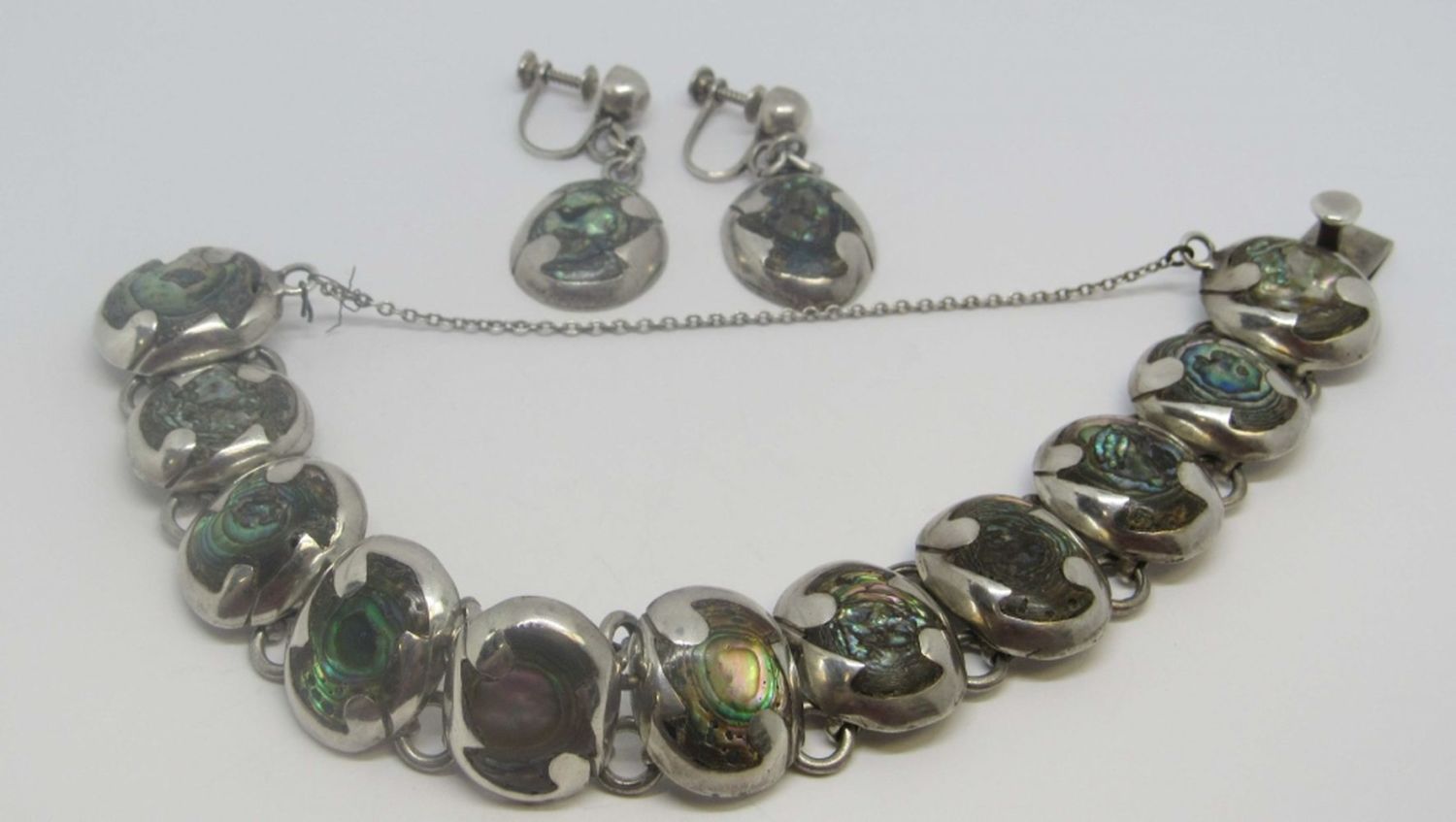 UNIQUE ABILONE INLAY DESIGN PLUS MATCHING PAIR OF TWIST BACK DANGLY EARRINGS-TTOAL 33 DWT