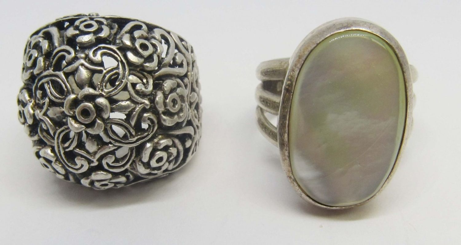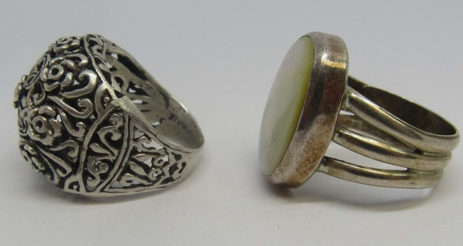 DESIGN & (1)WITH MOTHER OF PEARL INLAY STONE DESIGN-RING SIZES 7.5 & 10-TOTAL 12 DWT