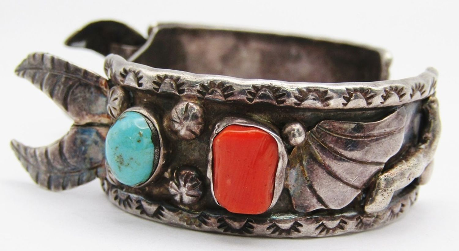 WITH TURQUOISE AND RED CORAL STONES-MEASURES 8 INCHES WITH GAP-TOTAL 29 DWT