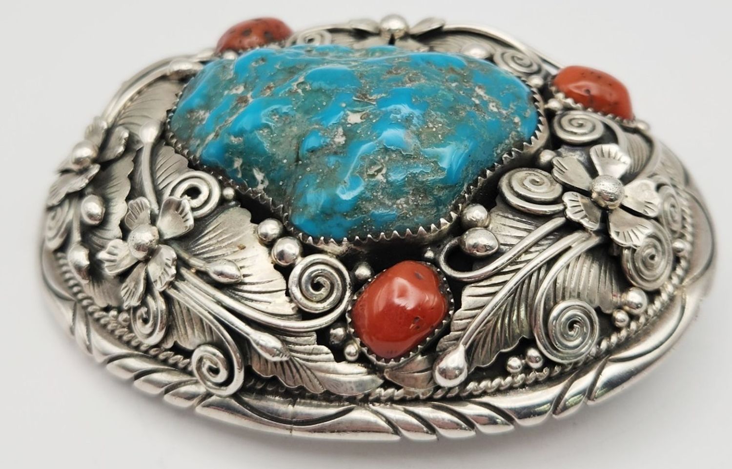 WITH LARGE TURQUOISE CENTER STONE & RED CORAL ACCENTS-FLOWER/LEAF DESIGN-TOTAL 71 DWT