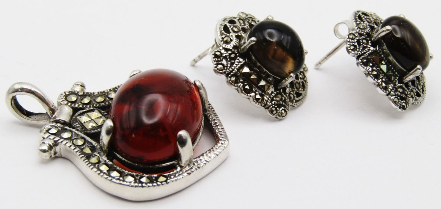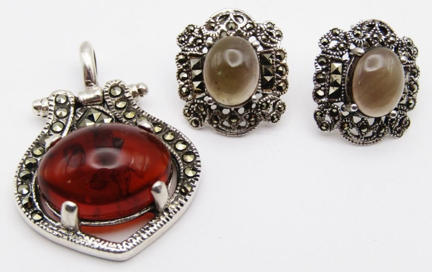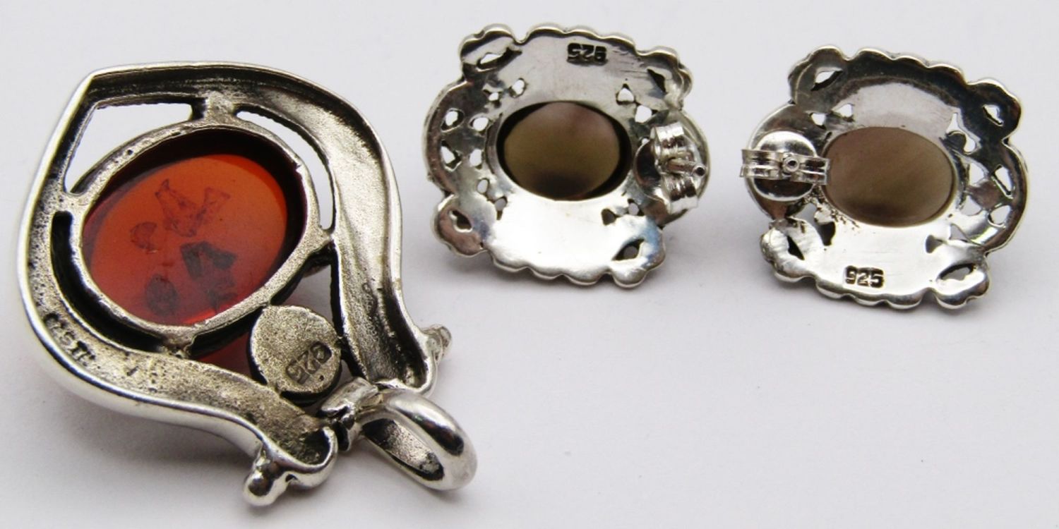 WITH BALTIC AMBER CENTER & (1)PAIR OF STUD EARRINGS WITH GRAY CENTER STONE-TOTAL 8 DWT