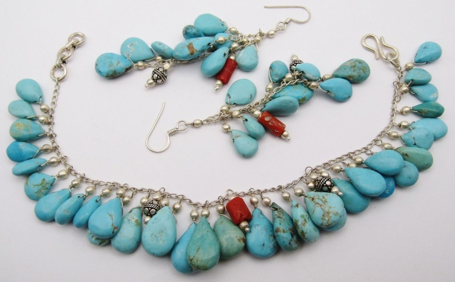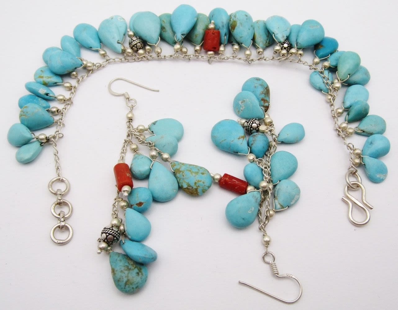 TURQUOISE BEAD CHARMS & RED CORAL ACCENTS WITH MATCHING PAIR OF PIERCED DANGLY EARRINGS-BRACELET MEASURES 8.5 INCHES