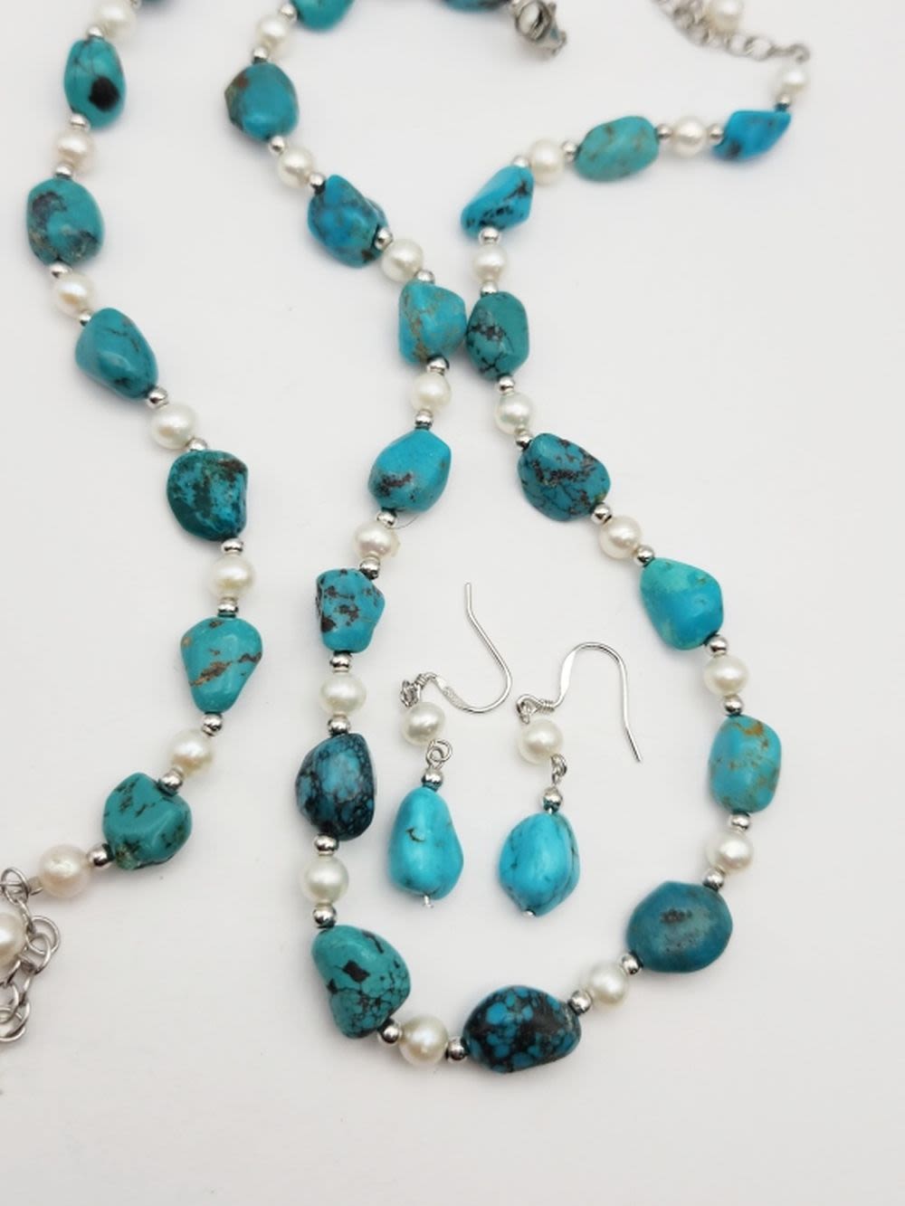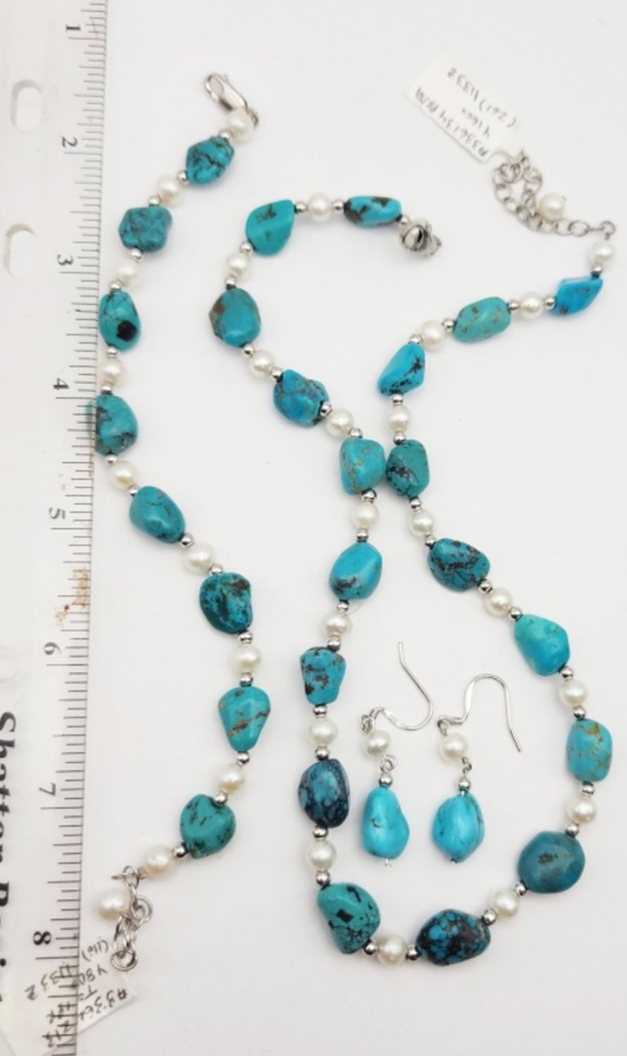 WITH PEARL ACCENTS-WITH MATCHING BRACELET AND PAIR OF DANGLY EARRINGS-NECKLACE MEASURES 19 INCHES & BRACELET MEASURES 8.5 INCHES-TOTAL 26 DWT
