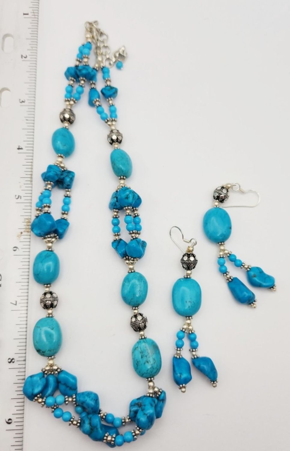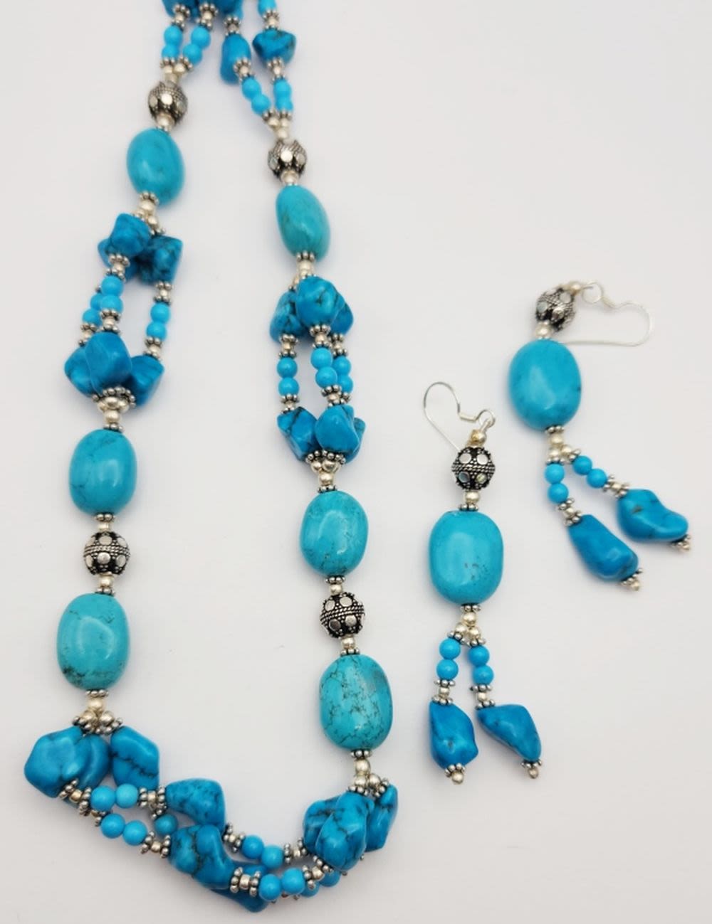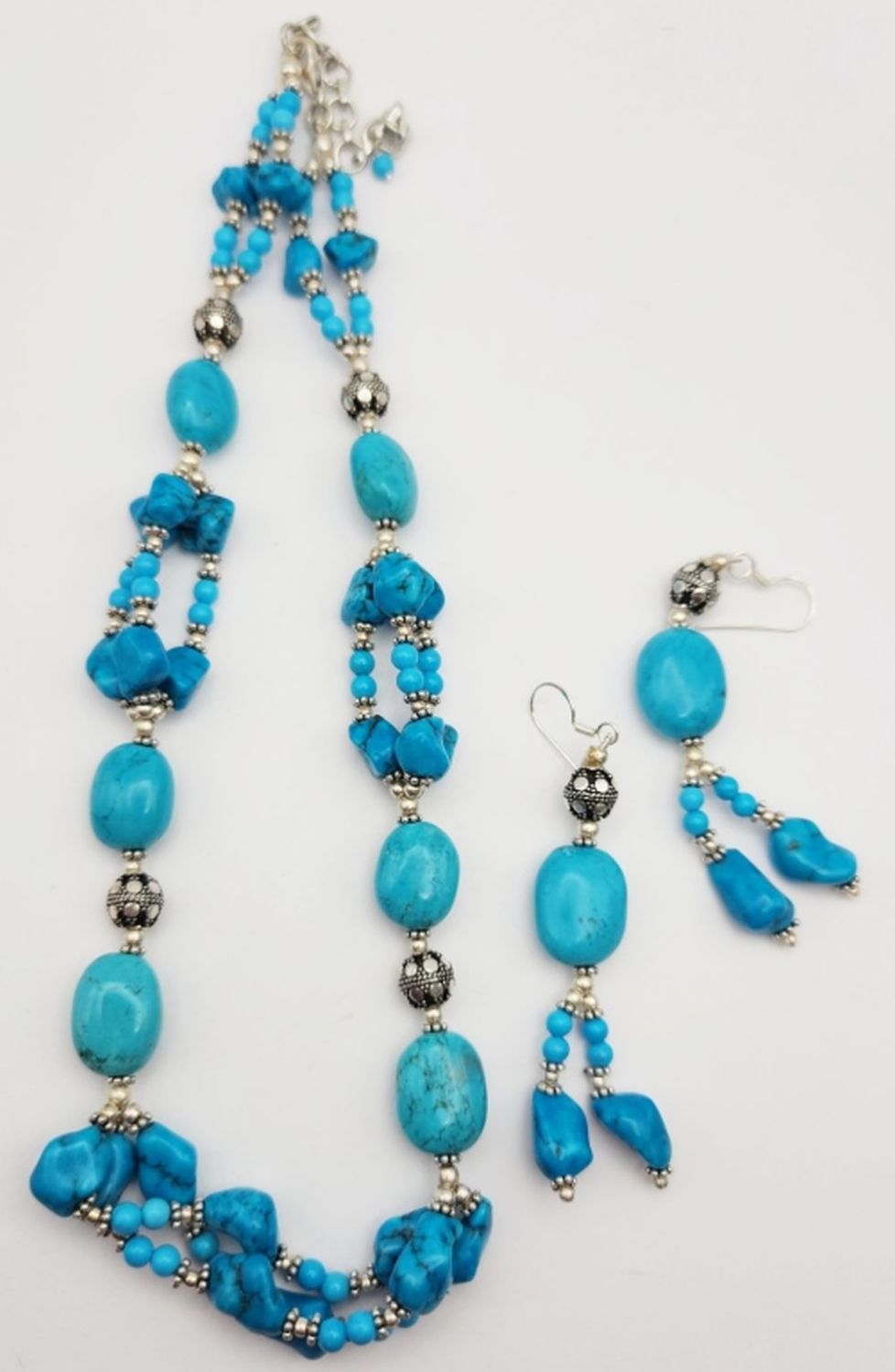 NECKLACE LOADED WITH TURQUOISE BEADS WITH MATCHING PAIR OF PIERCED DANGLY EARRINGS-TOTAL 57 DWT