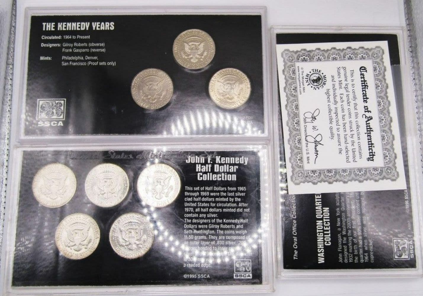 (2) SILVER QTRS (4) CLAD WASHINGTON QTR, (5) 40% SILVER KENNEDY YEARS-1965-1969, (3) KENNEDY P-D-S SET