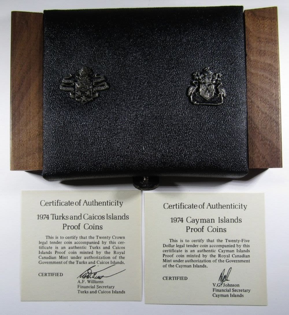 CAYMAN ISLANDS $25 AND TURKS & CAICOS ISLANDS 20 CROWN, ROYAL CANADIAN MINT. WITH BOX, CASE, AND COA.