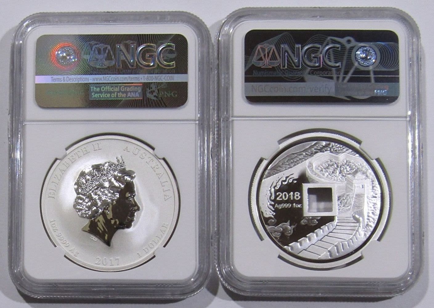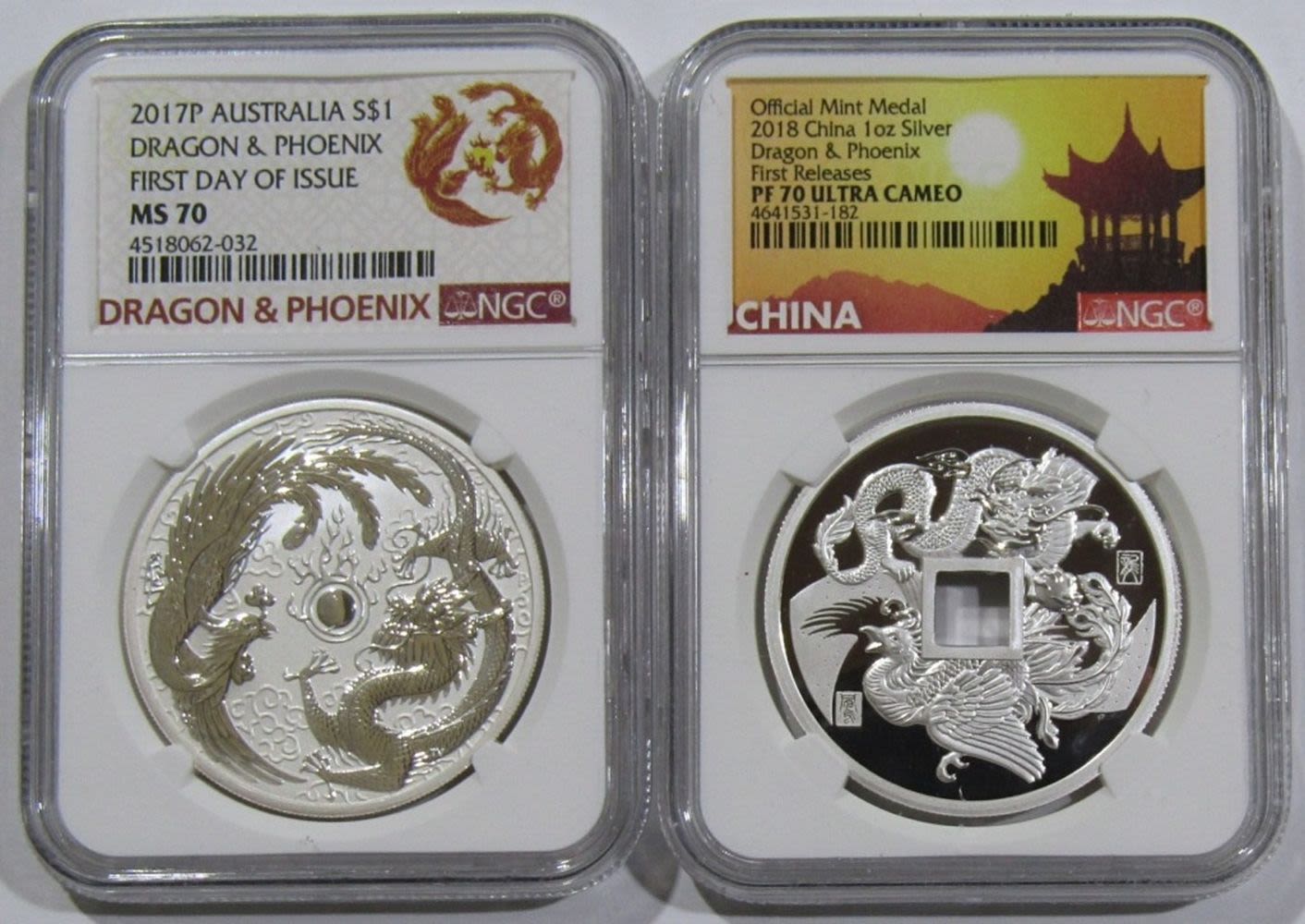 SET OF 2 NGC GRADED COINS: 2017P AUSTRALIA MS-70 FIRST DAY OF ISSUE & 2018 CHINA PF-70 UC FIRST RELEASES. IN BOX WITH CHINA COA