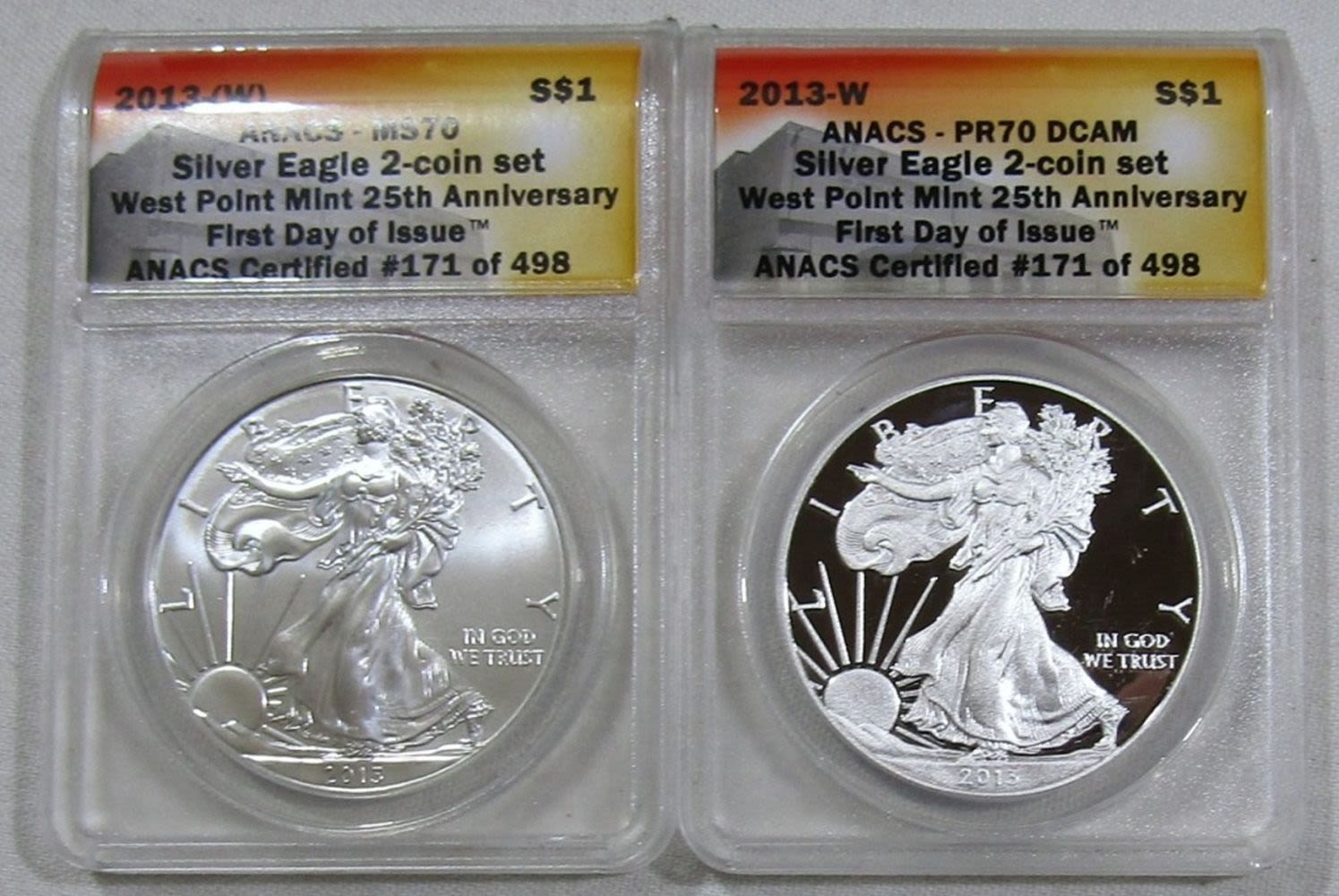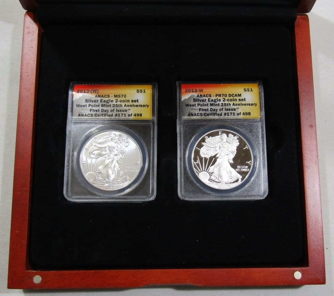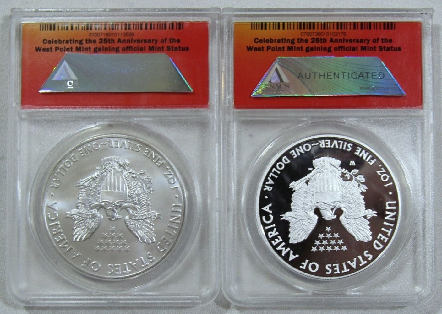 ANACS GRADED WEST POINT MINT 25TH ANNIVERSARY SET MS-70 & PR-70 DCAM, BOTH FIRST DAY OF ISSUE. IN DISPLAY CASE.