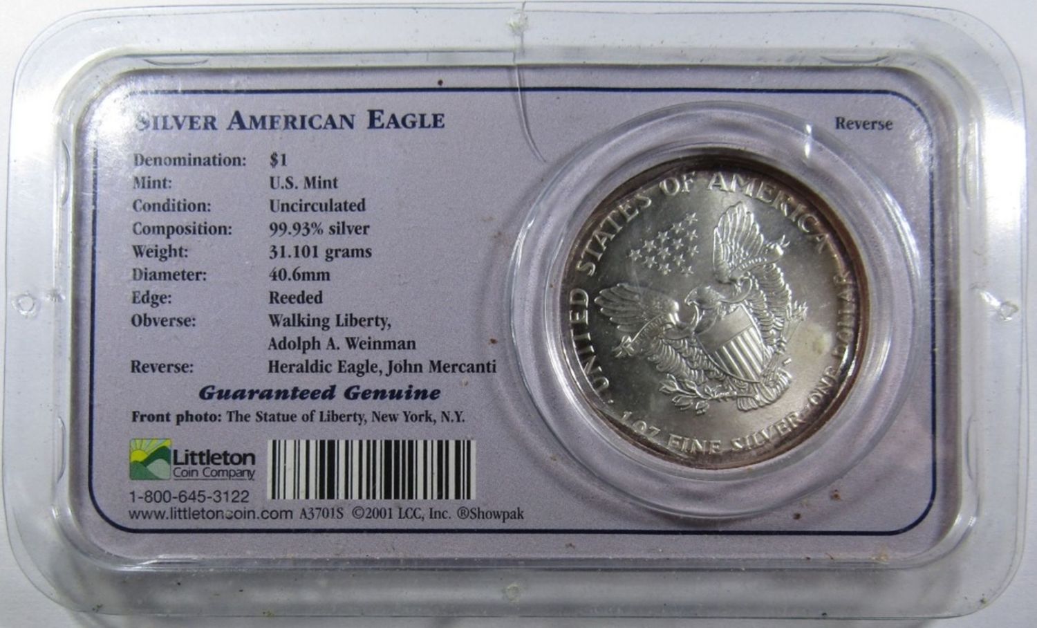 AMERICAN SILVER EAGLE 1ozt .999 PURE SILVER