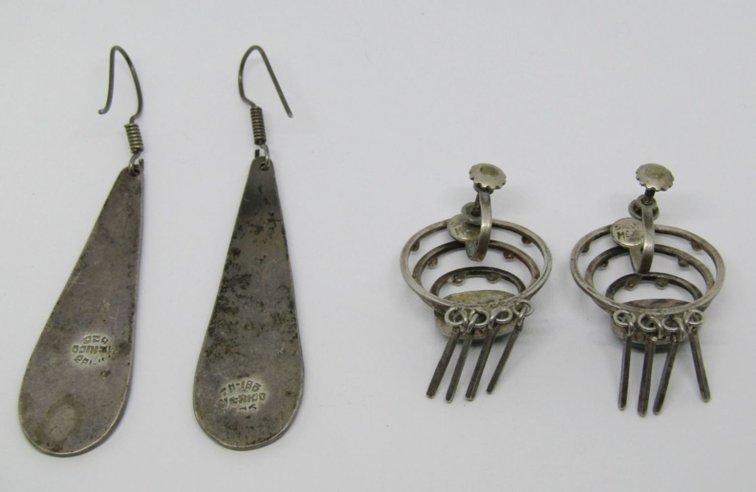 (1)TWIST BACK WITH JADITE (1)MEXICO DANGLY PEIRCED WITH CHPPED TURQUOISE AND MALACHITE INLAY DESIGN-TOTAL 17 DWT