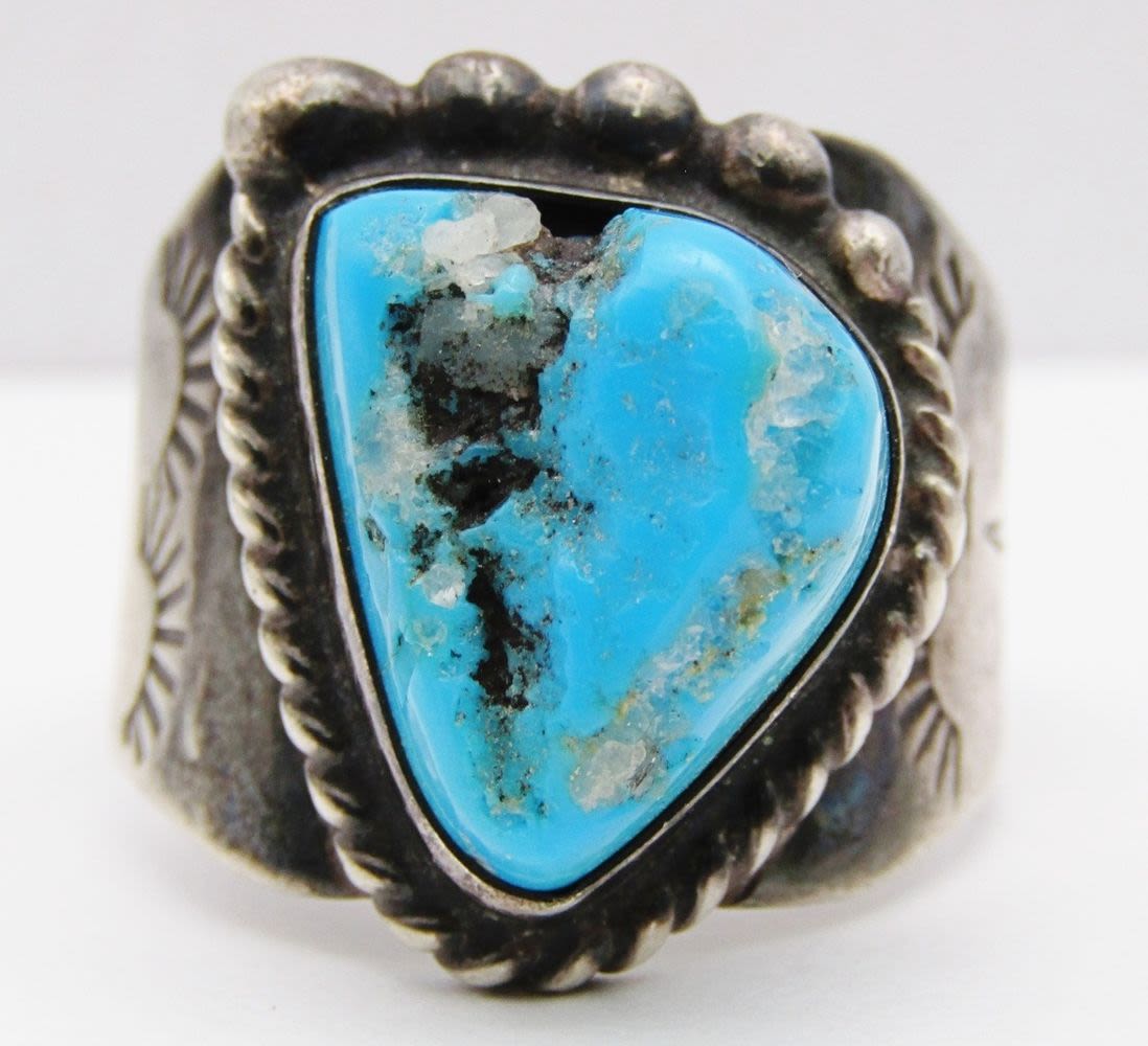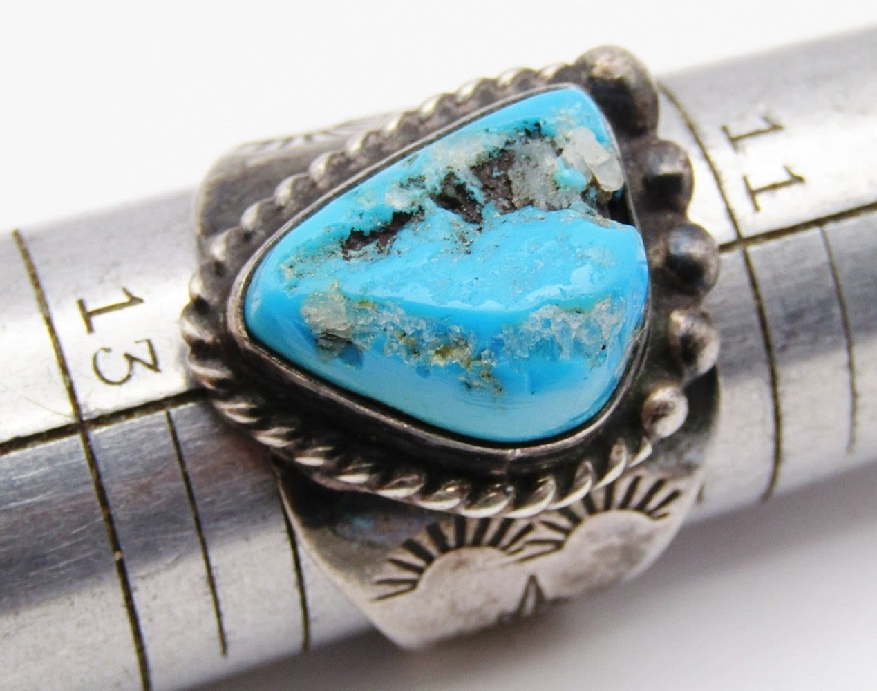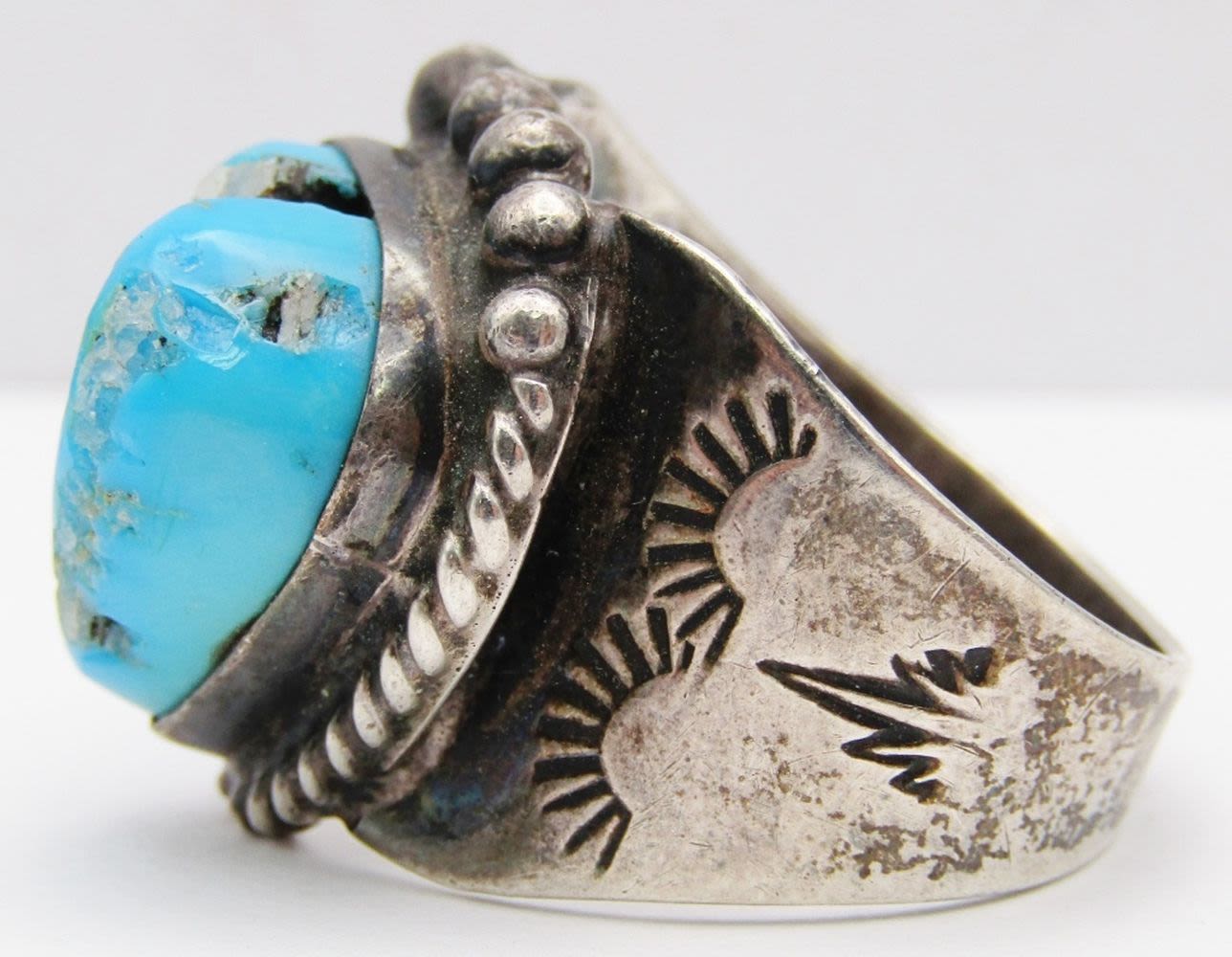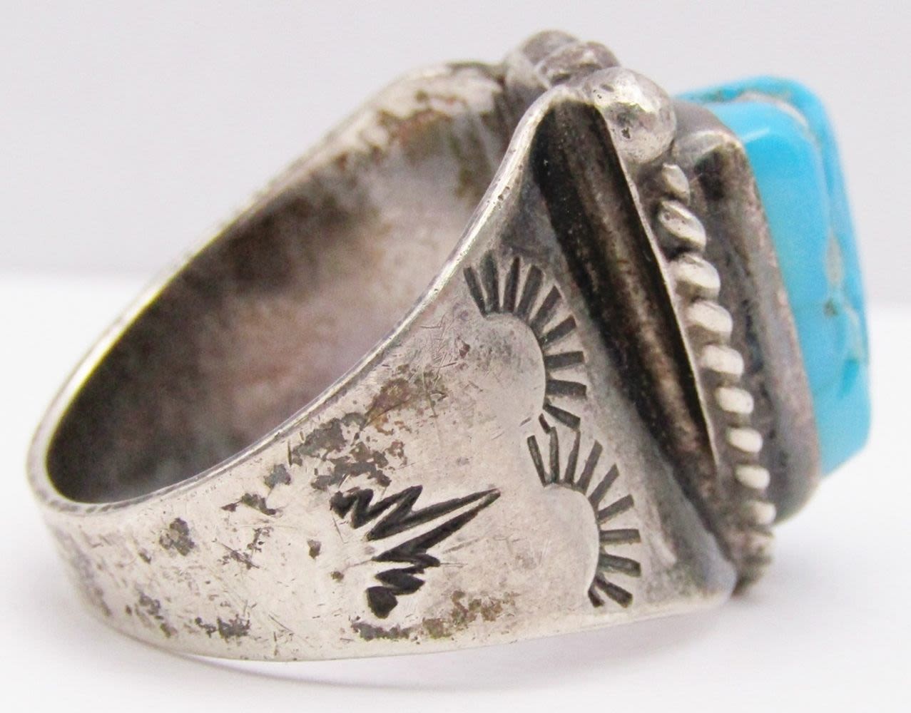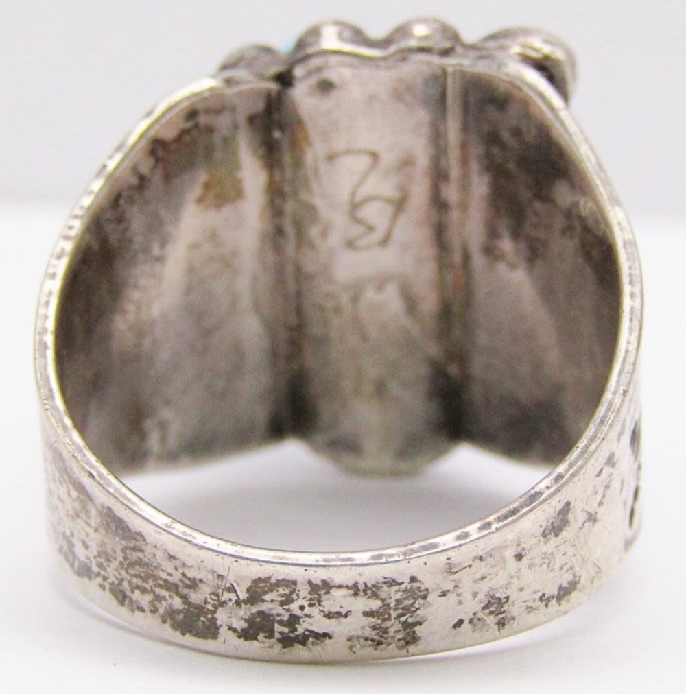 TURQUOISE CENTER STONE-ENGRAVED DESIGN ON BAND-RING SIZE 12-TOTAL 10 DWT