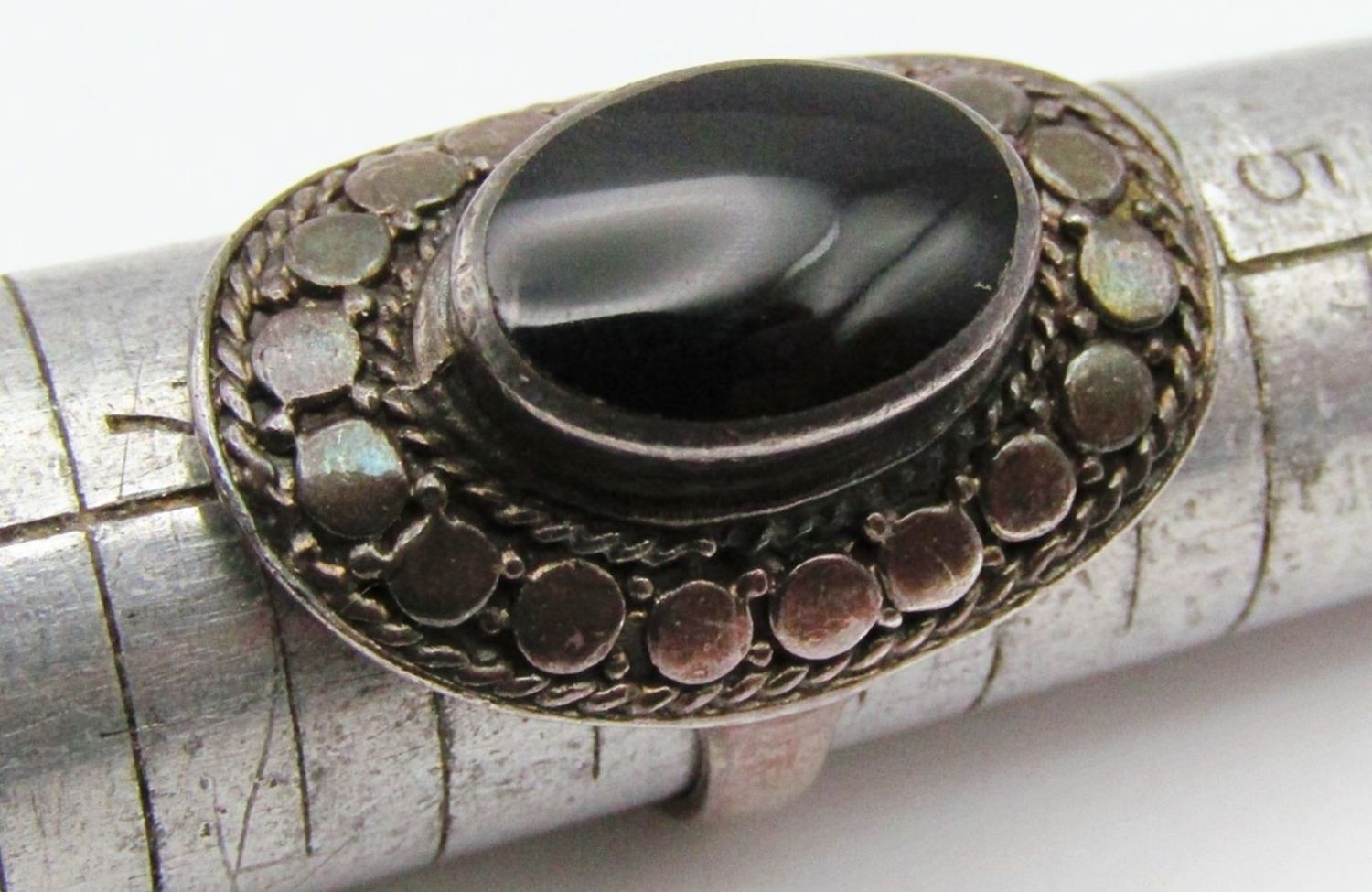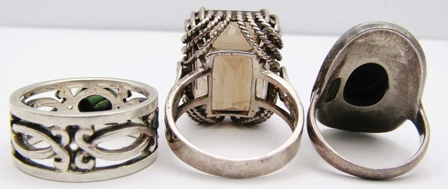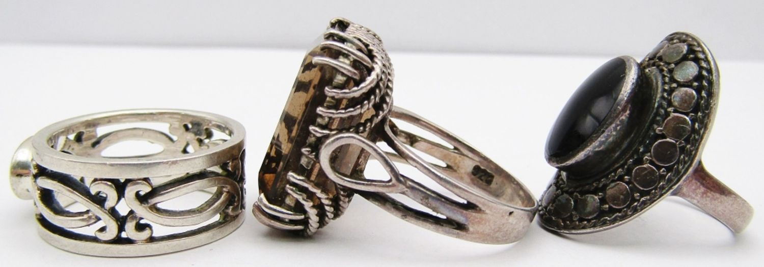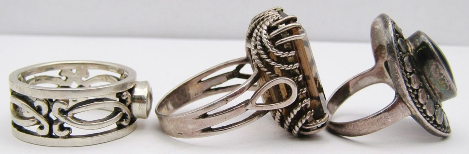 SMOKEY QUARTZ SIZE 8.5, BLACK ONYX SIZE 6, ABALONE BAND SIZE 8 ( 16 DWT)