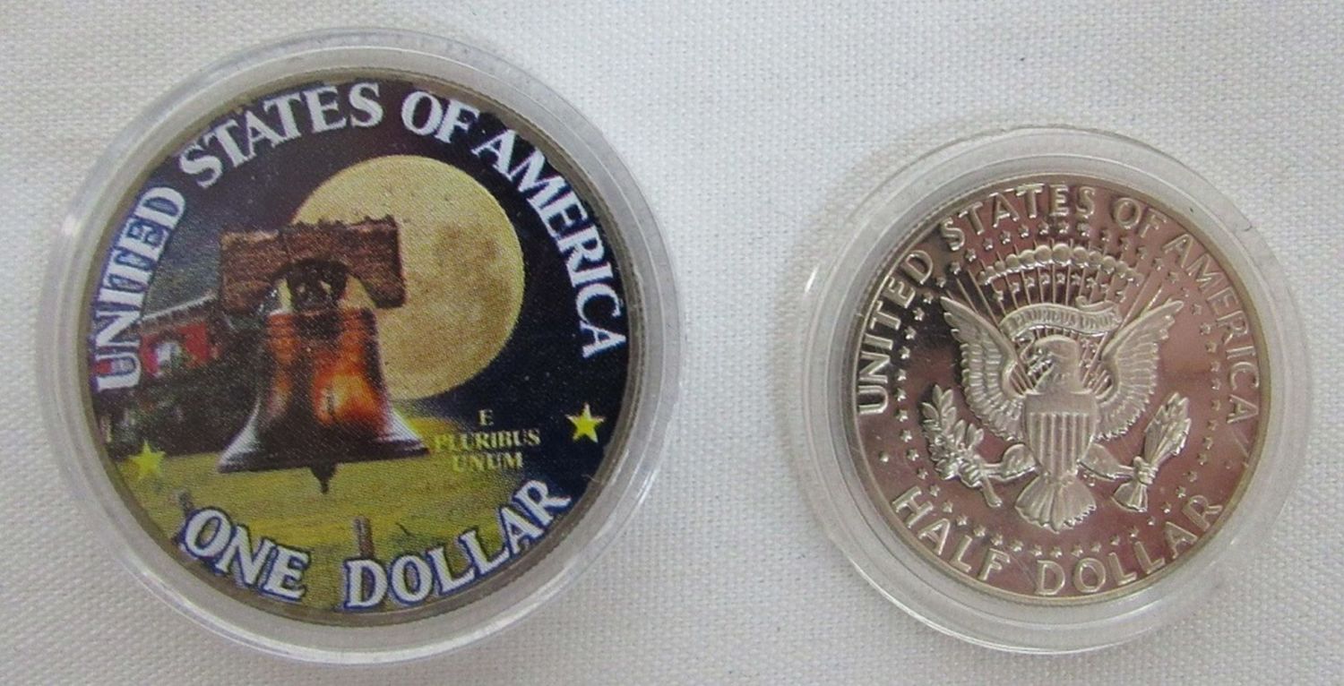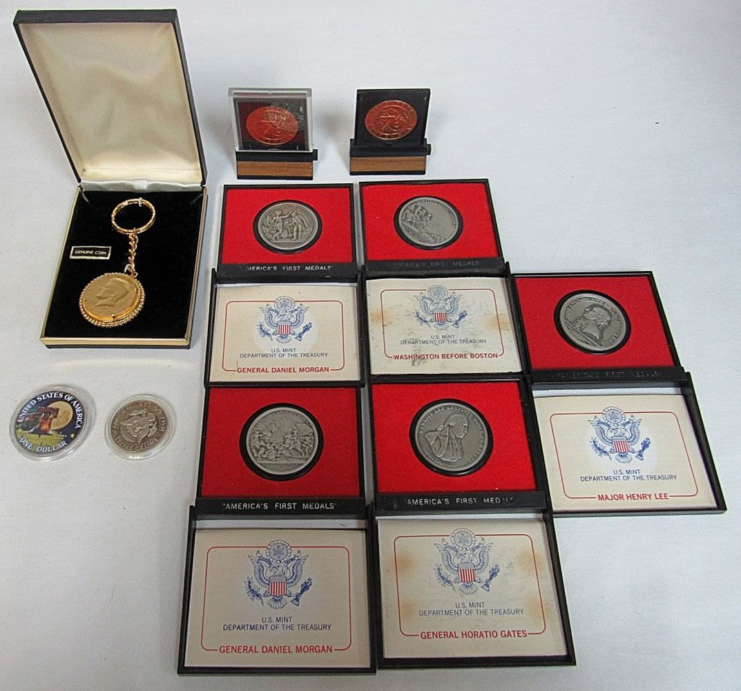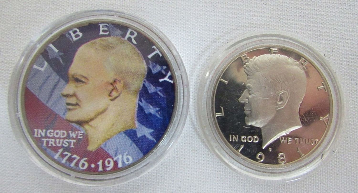 plus (2) 1976 CENTENNIAL COINS – KENNEDY KEY CHAIN, 1981 PROOF KENNEDY, 1976 IKE COLORIZED COIN