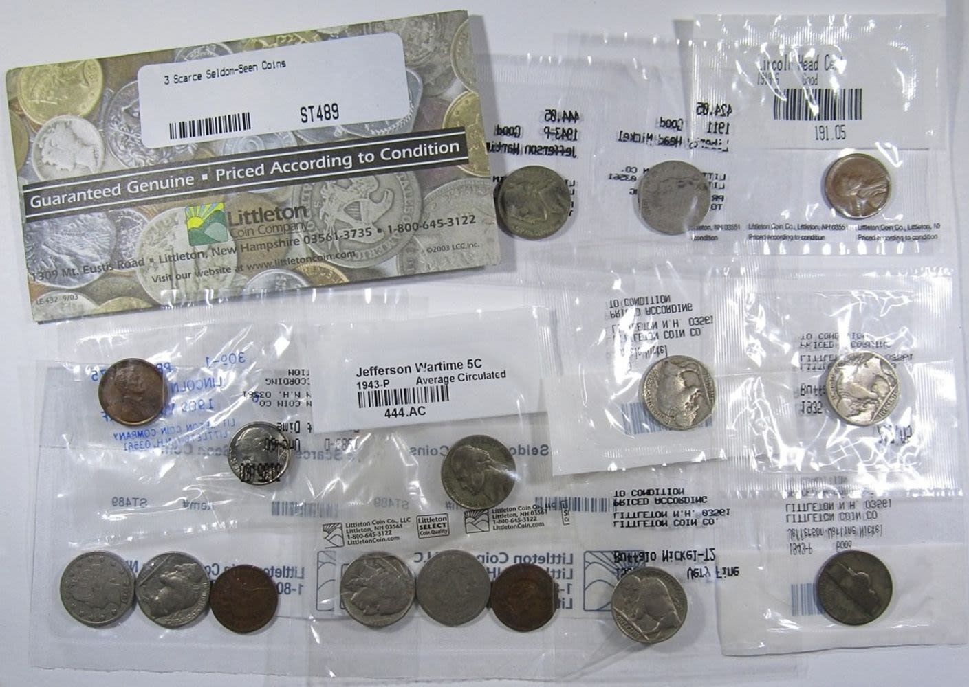 LITTLETON PACKS – (3) BUFFALO NICKELS, (3) SILVER WAR NICKELS, 1911 “V” NICKEL, 3-PACKS of SCARCE SELDOM SEEN COINS INDIAN CENT, BUFFALO & LIBERTY NICKELS, 1909 VDB CENT , 1919-S CENT, 1989-D DIME