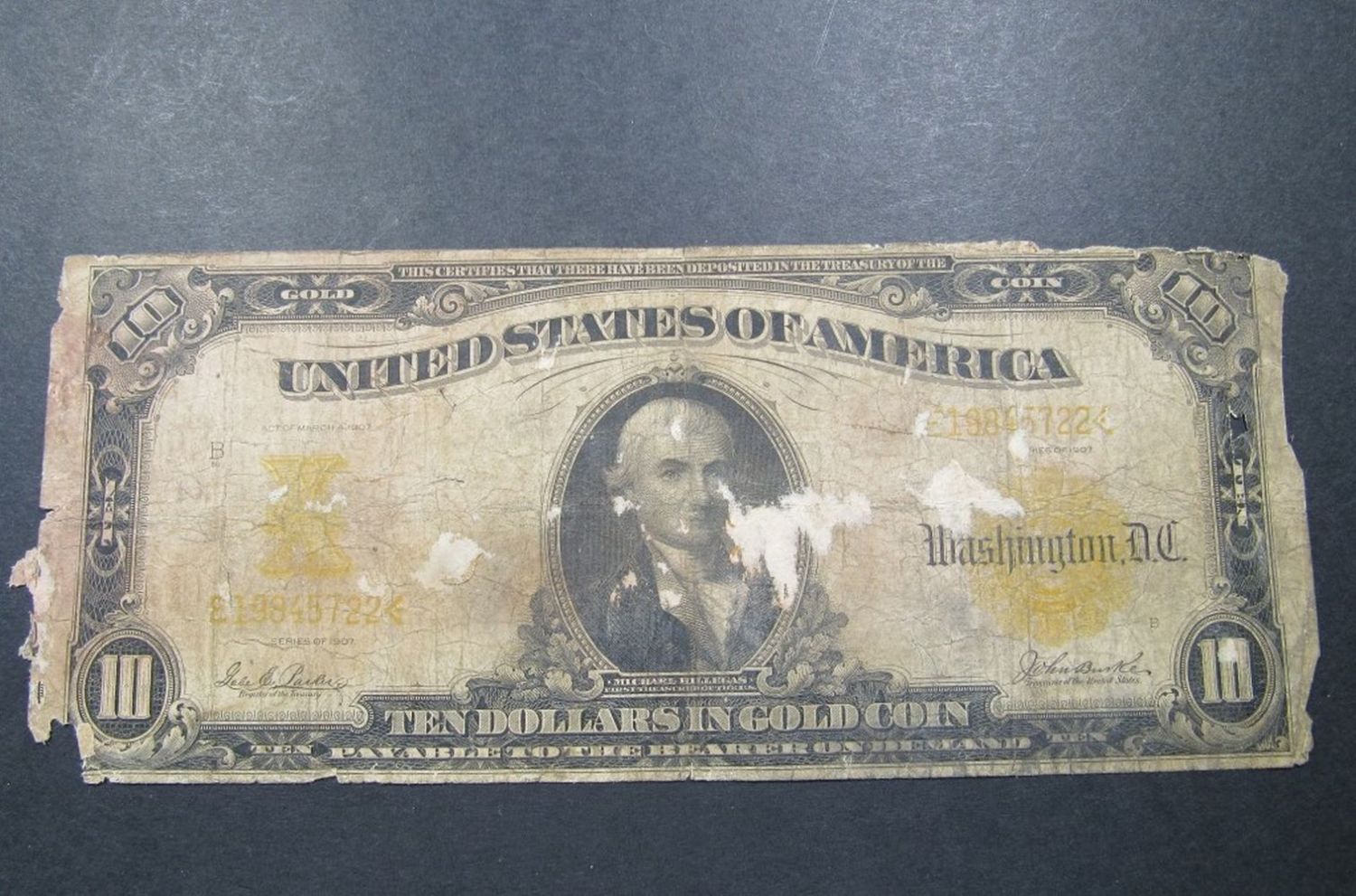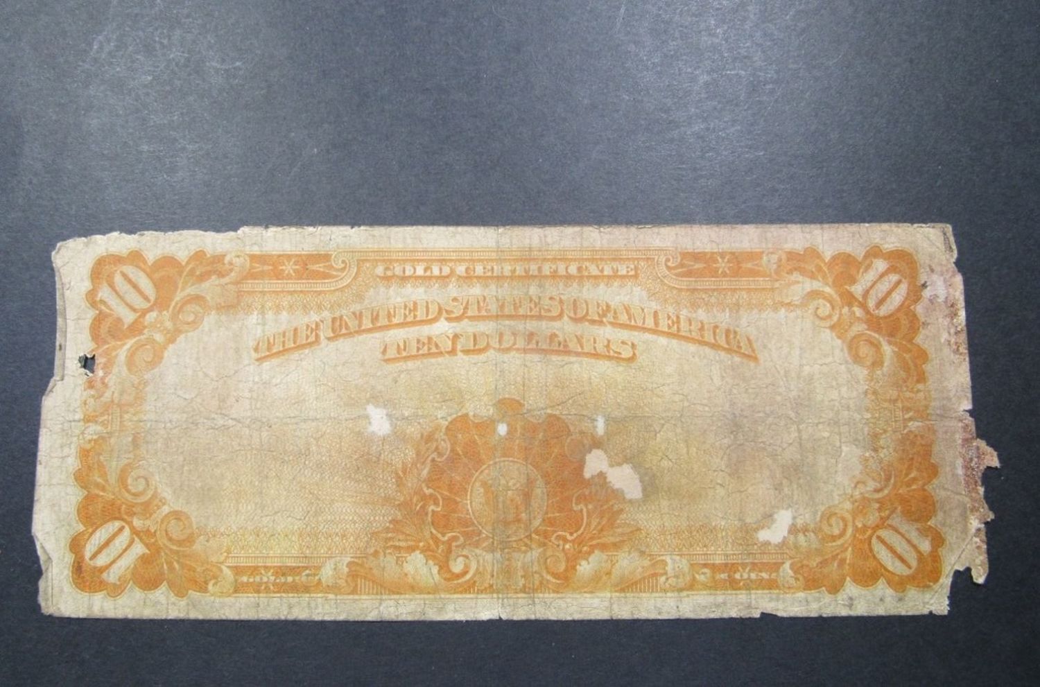 TEN DOLLARS IN GOLD COIN – LIGHT PAPER MISSING – MINOR TEAR UPPER LEFT CORNER – RARE NOTE