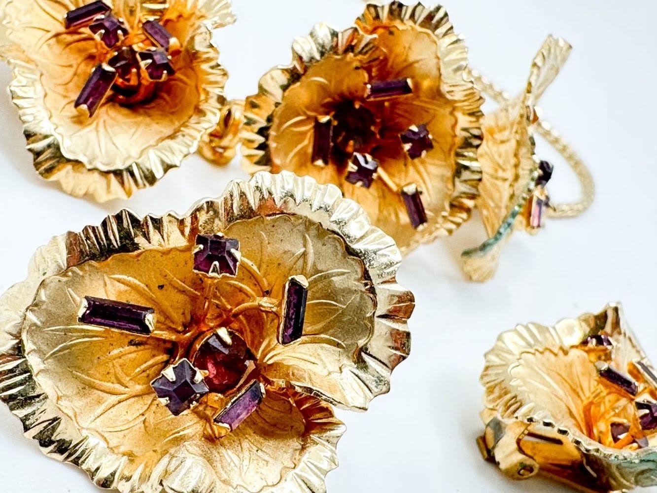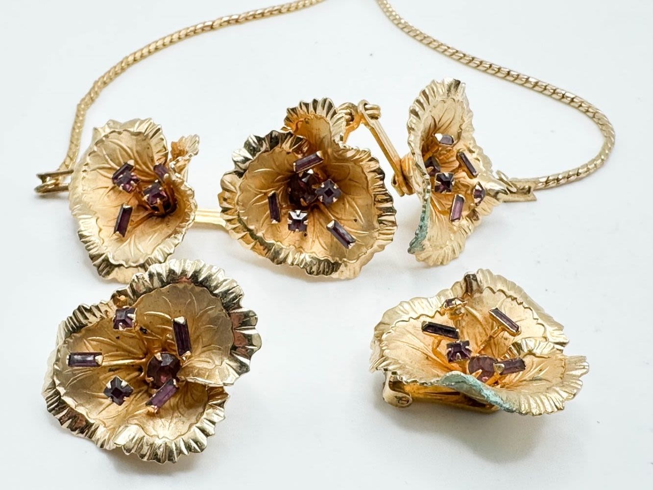 VINTAGE BLOSSOMS WITH PURPLE STONE NECKLACE AND EARRING SET ON GOLD TONE