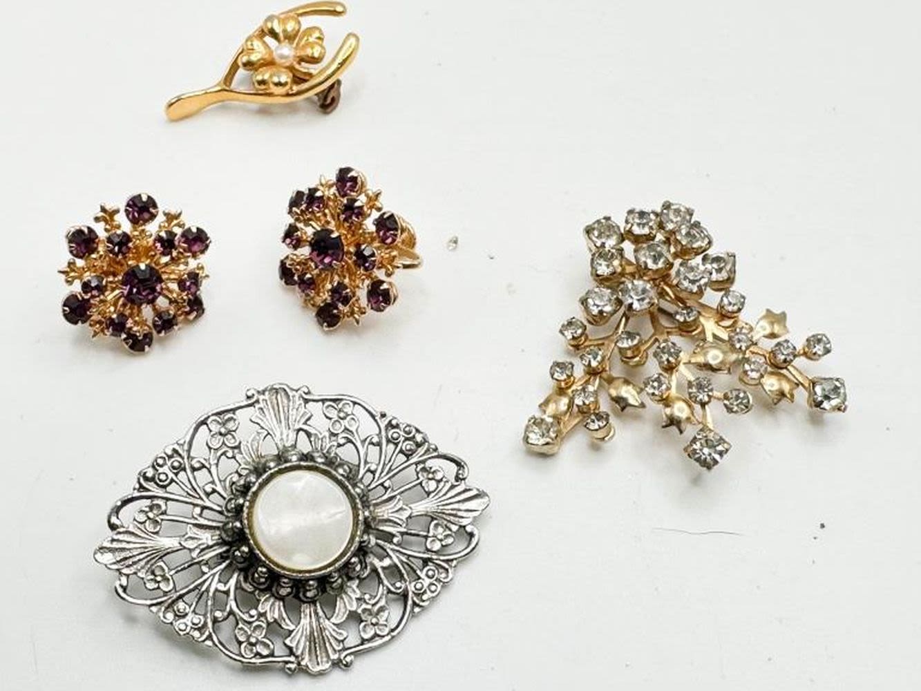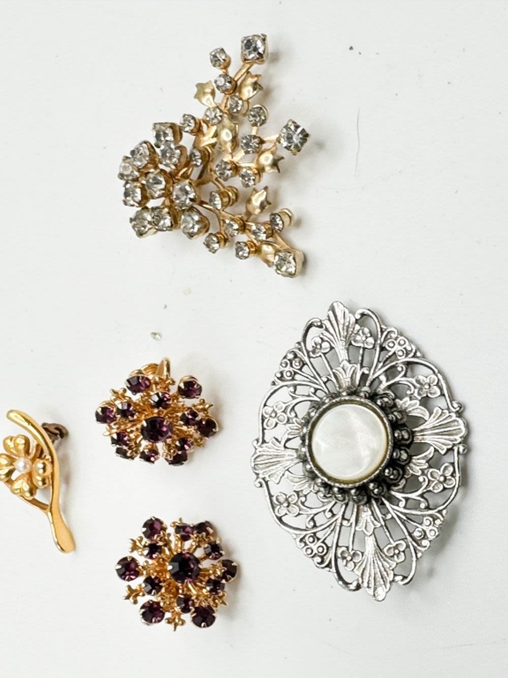 2 BROOCHES, EARRINGS, RHINESTONES AND MORE