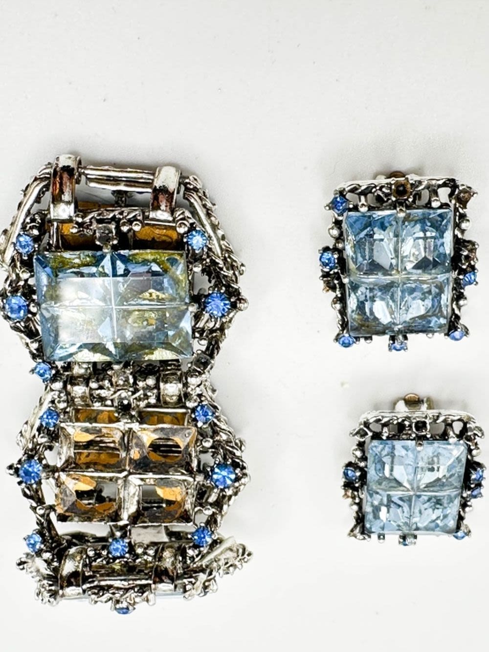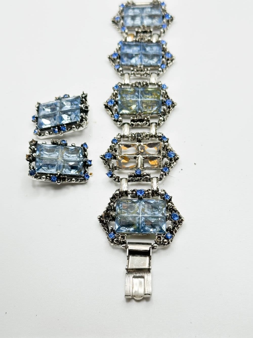 BRACELET SET WITH LARGE SKY BLUE STONES WITH EARRINGS, MISSING ONE BRACELET STONE