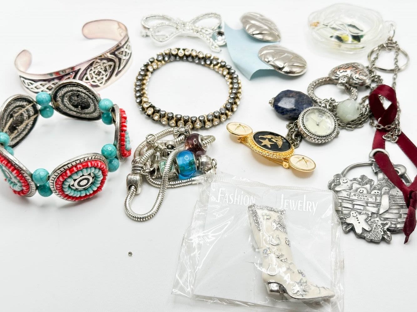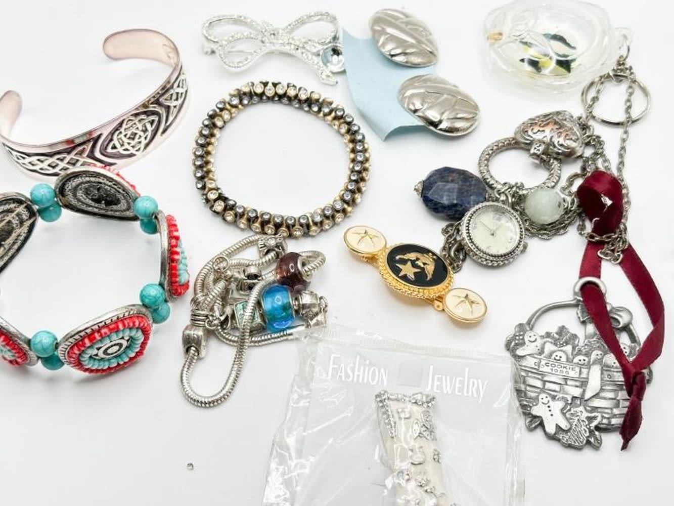 BRACELETS, NECKLACES, BROOCHES, WATCH, ONE BROOCH MAY BE MISSING A STONE