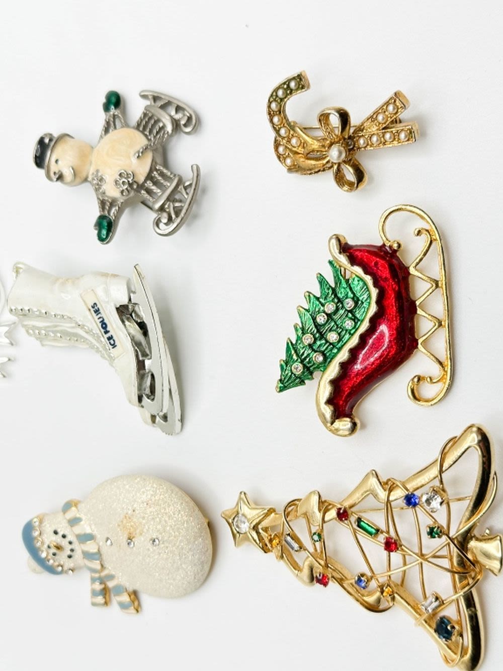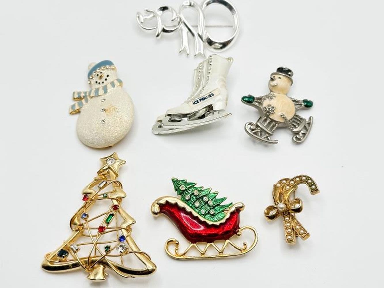 CHRISTMAS ASSORTED BROOCHES, SNOWMAN, TREE, SLEIGH, SKATE , CANDY CANES