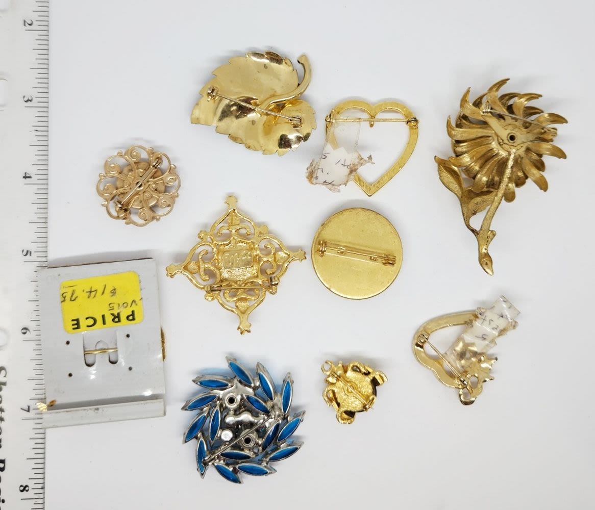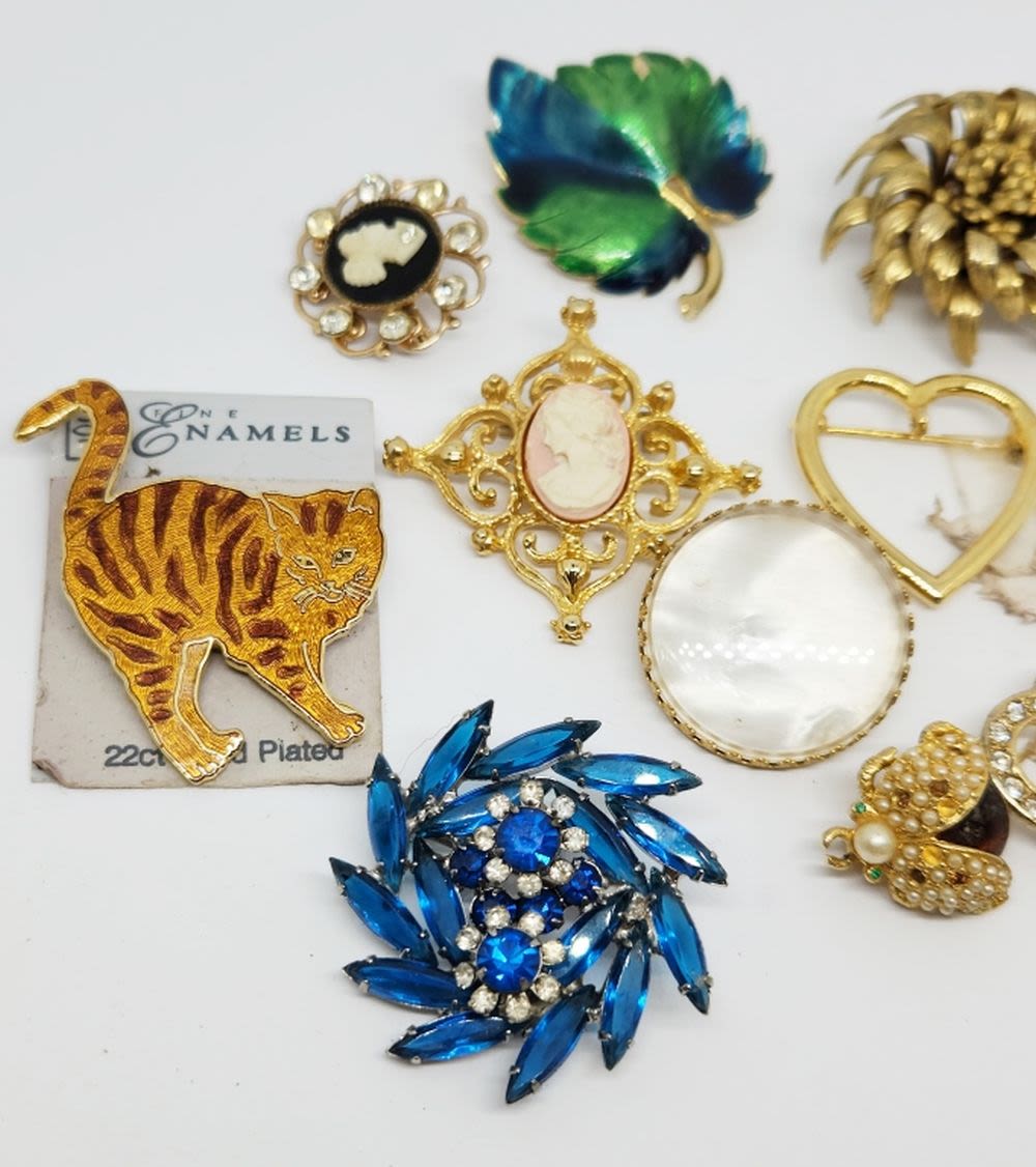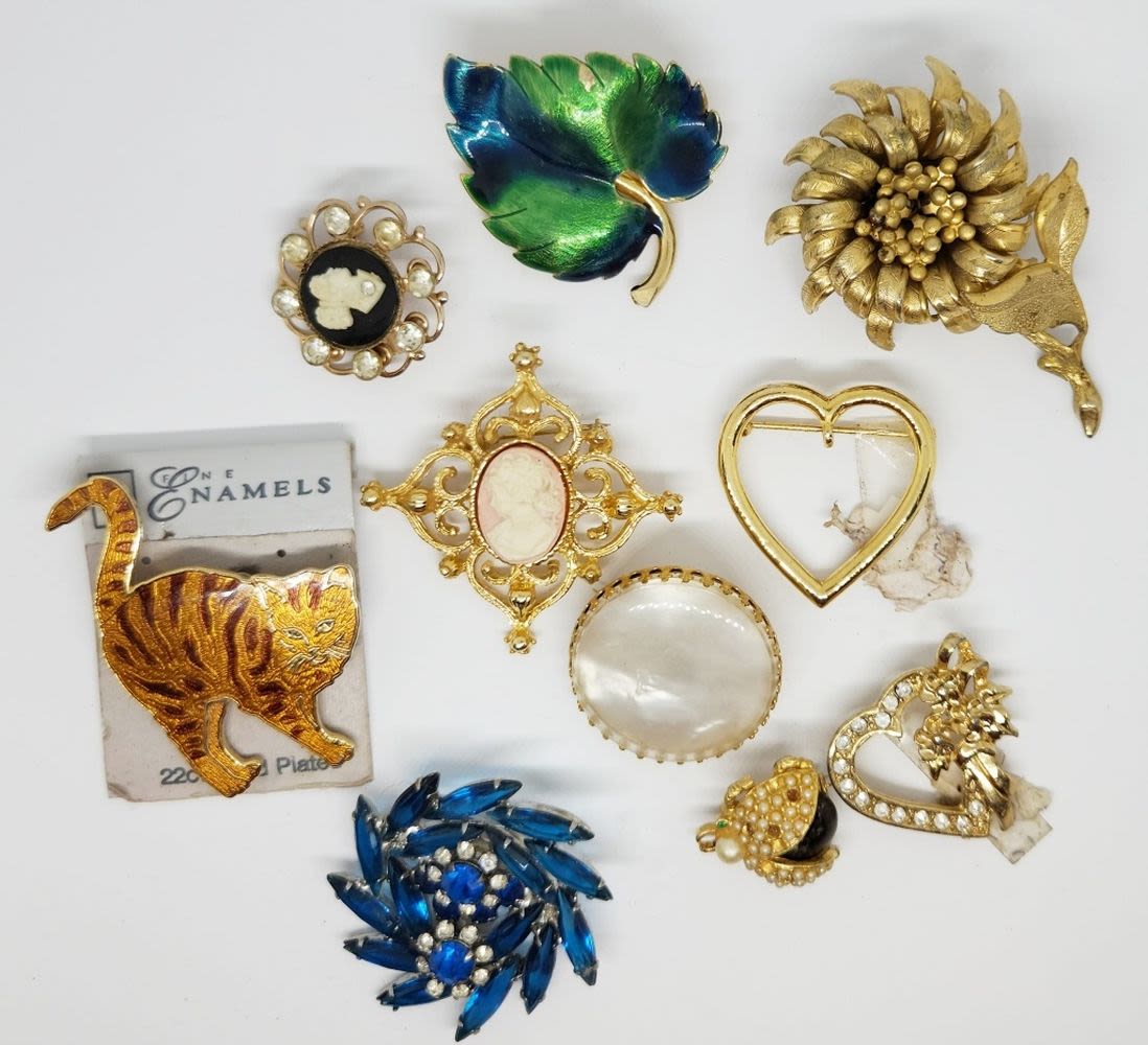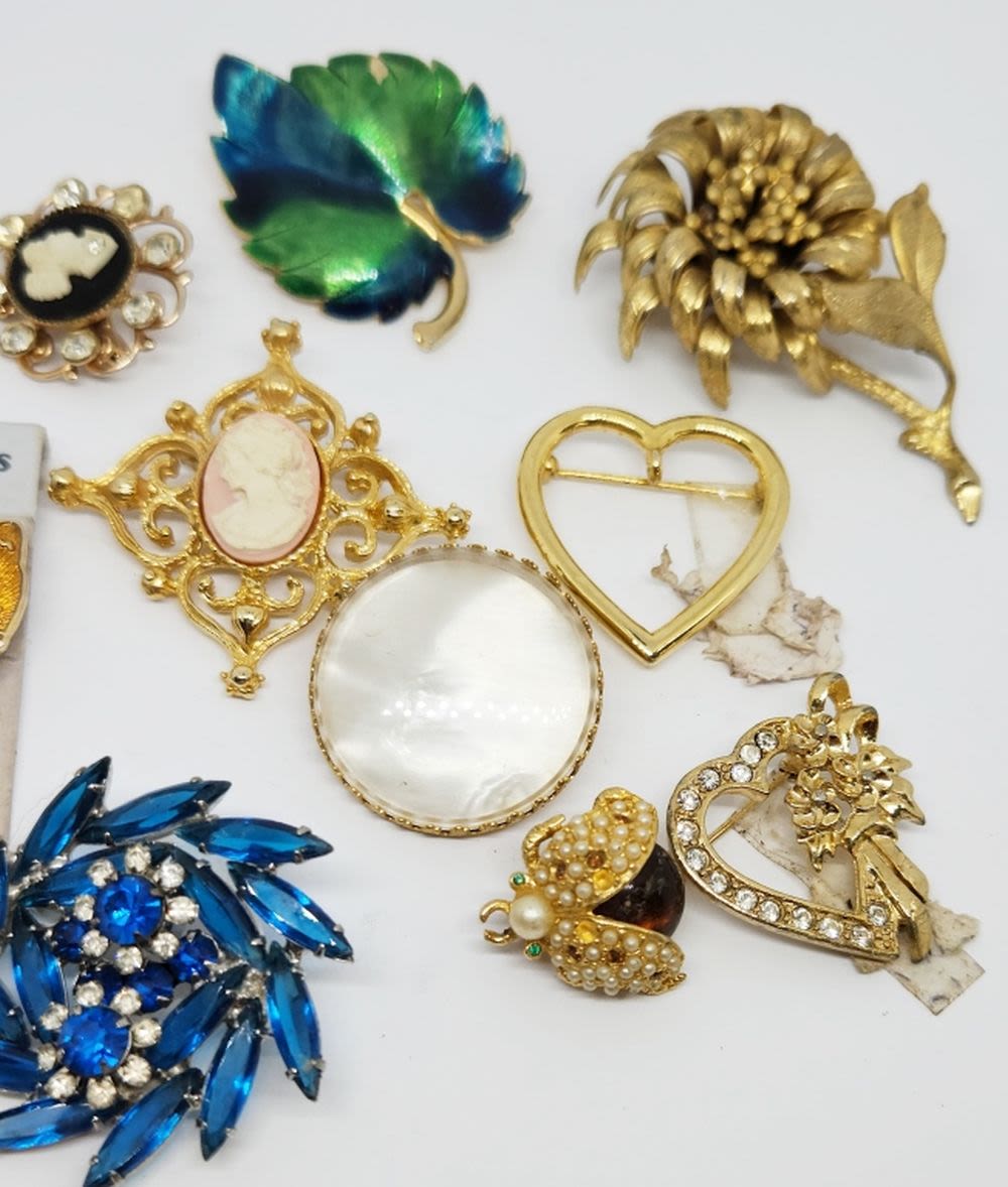 BROOCH COLLECTION, CAMEO HEART, ROSE, BLUE STONE ++