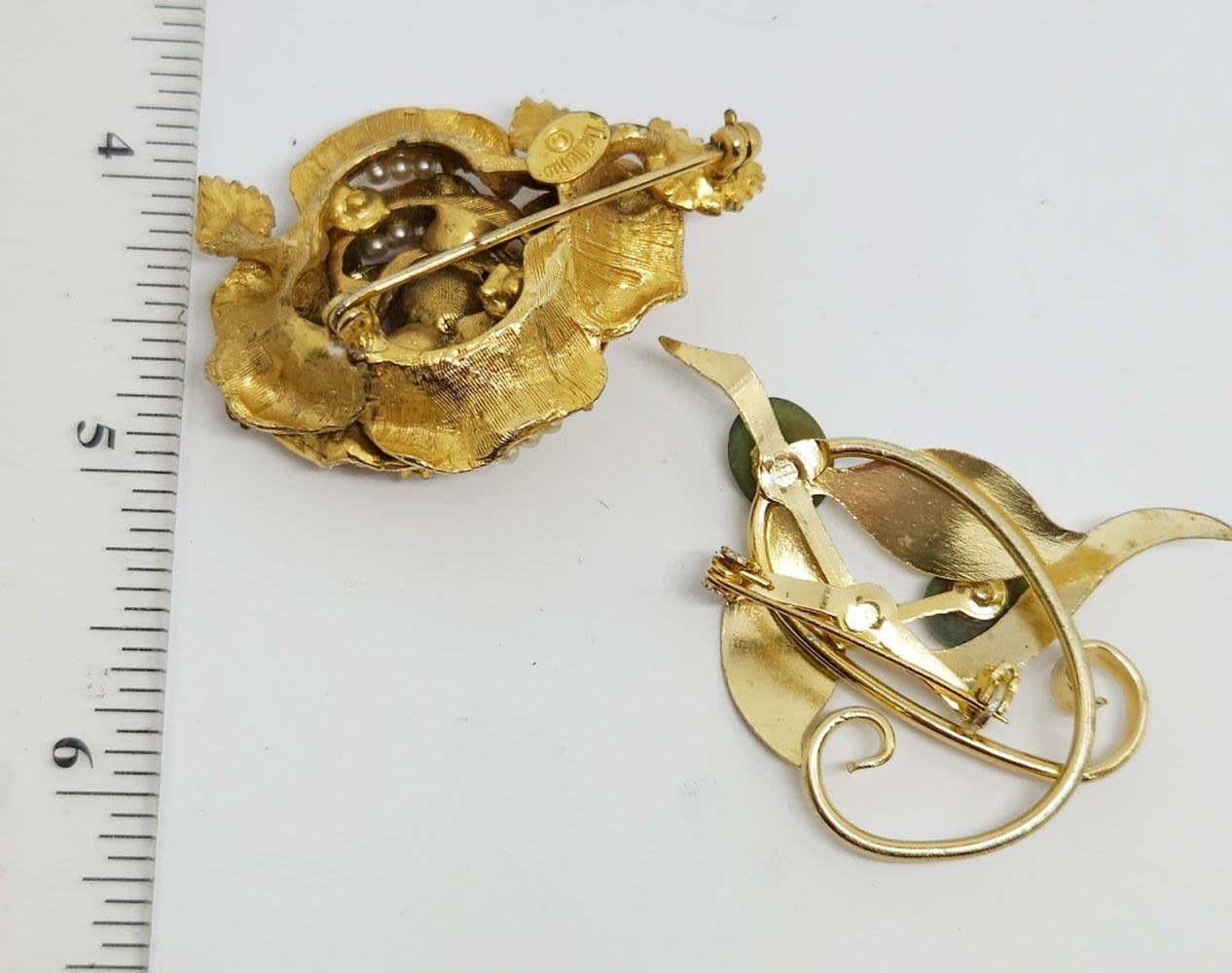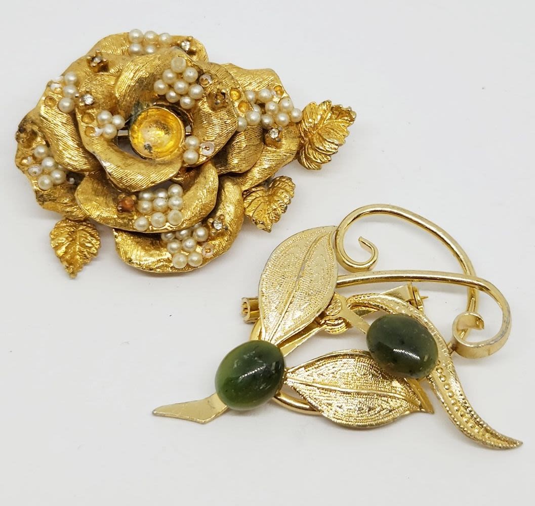 DEMARIO SIGNED BROOCH, MISSING A FEW STONES, AND OTHER GREEN STONE BROOCH