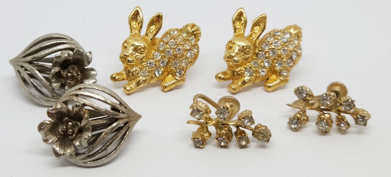 LISNER SIGNED VINTAGE EARRINGS SET AND RHINESETONE EARRINGS AND 2 RABBIT STONE PINS