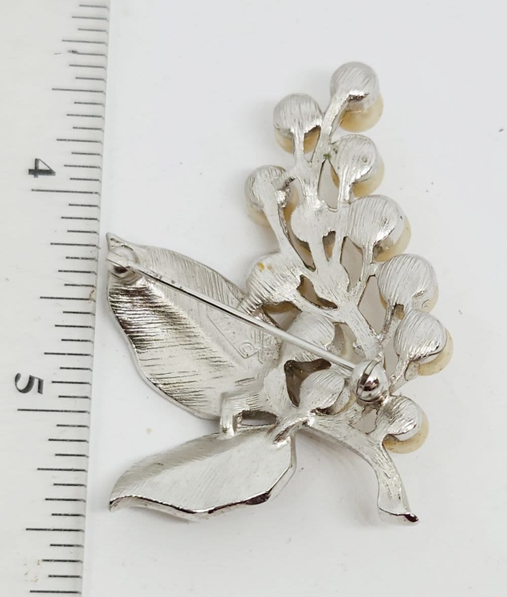 TRIFARI CROWN BROOCH WITH FAUX PEARL AND LEAVES IN SILVER TONES
