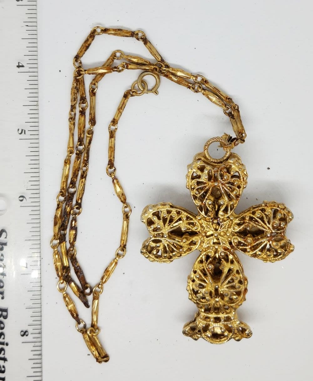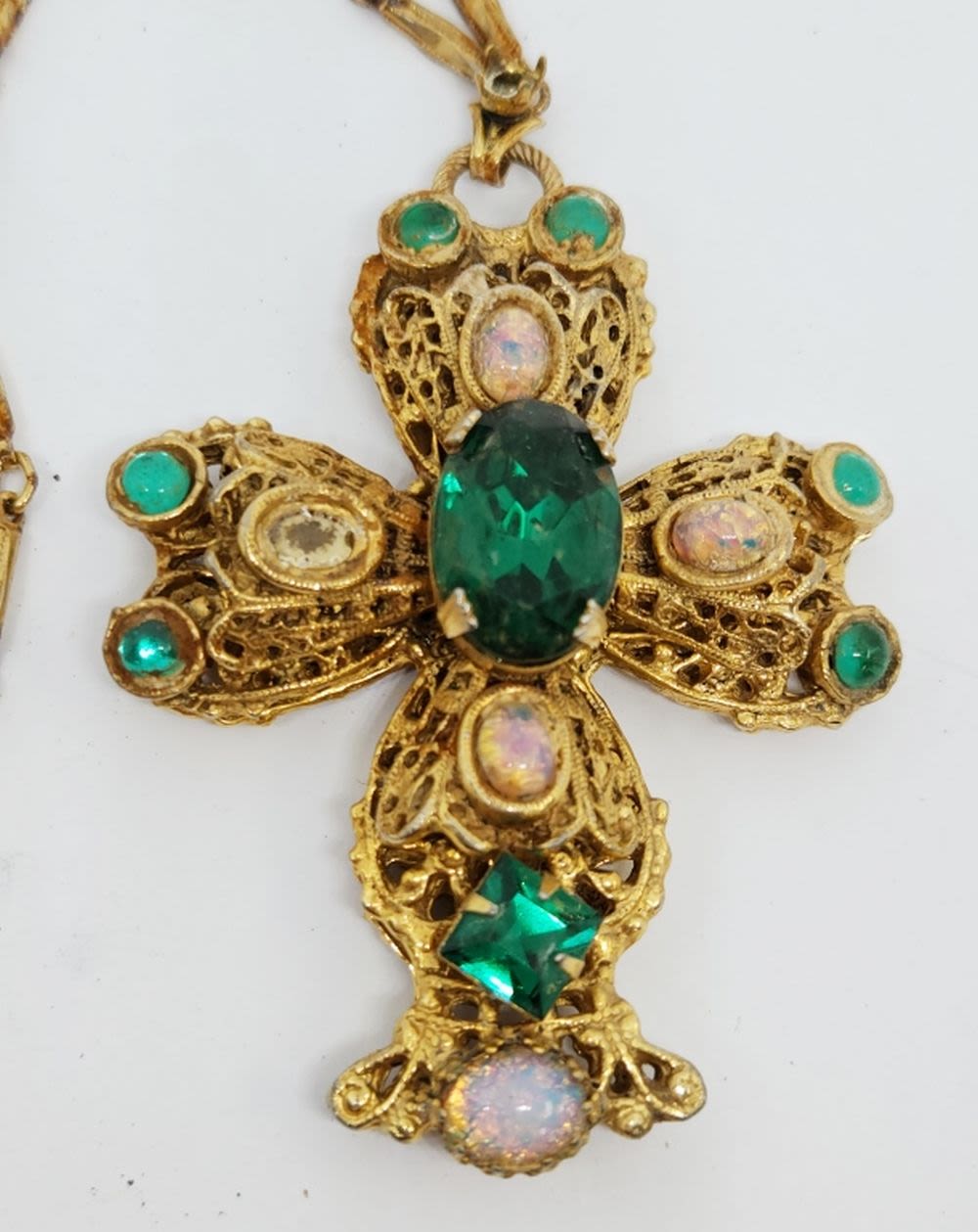 LARGE FILIGREE CROS WITH MULTI STONES, MISSING A STONE