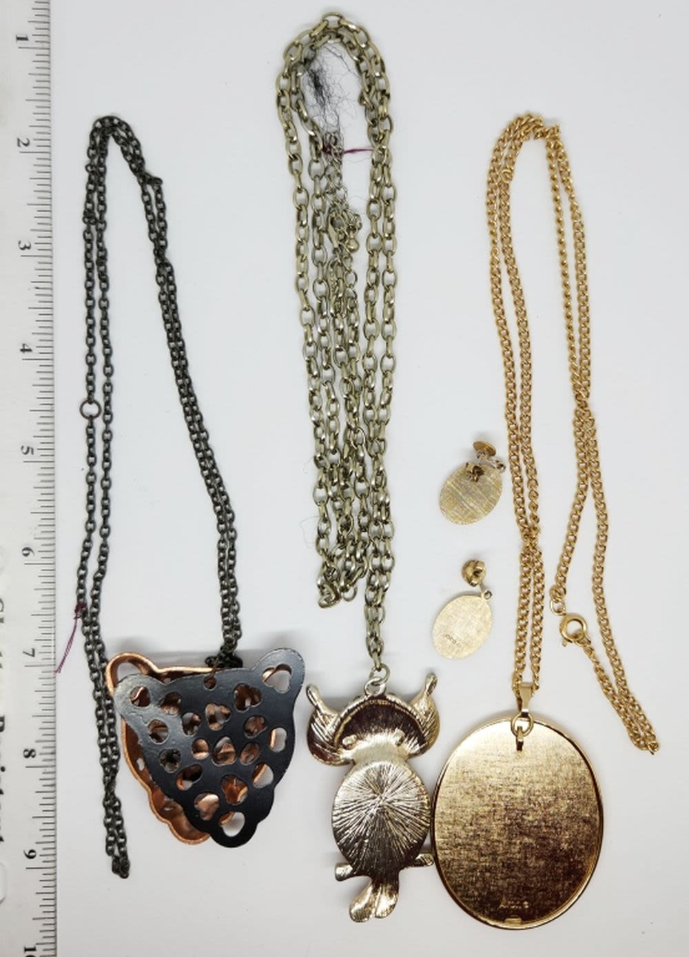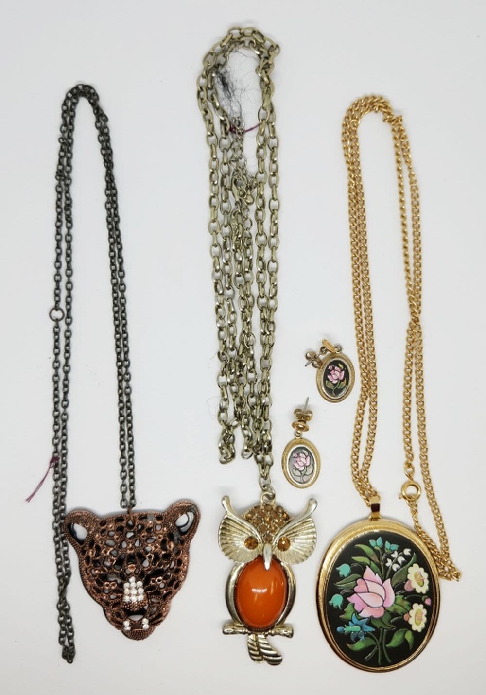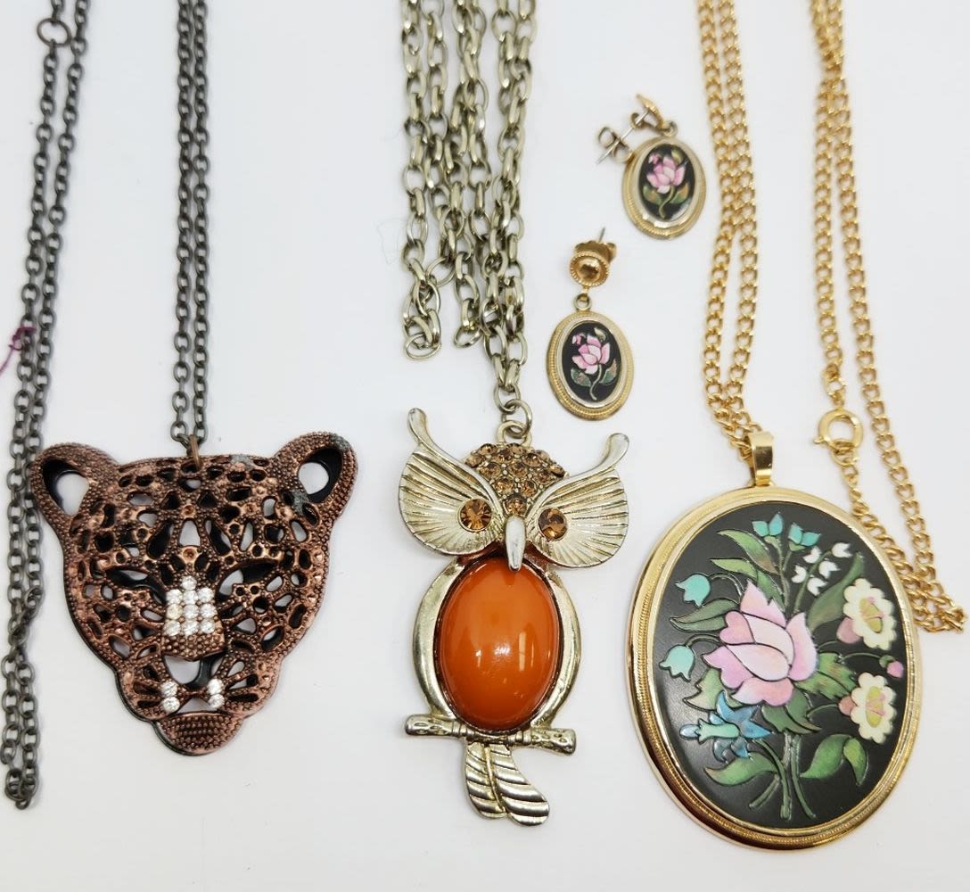 3 VINTAGE NECKLACES, FLORAL, OWL, LARGE CAT