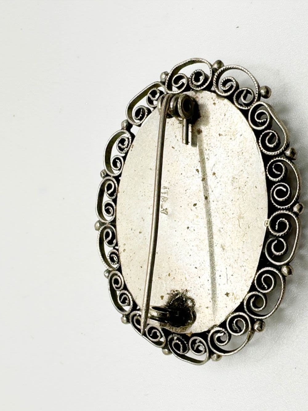 RED FLORAL MOSAIC BROOCH, FULL OF COLOR, VERY NICE SCROLLWORK EDGE