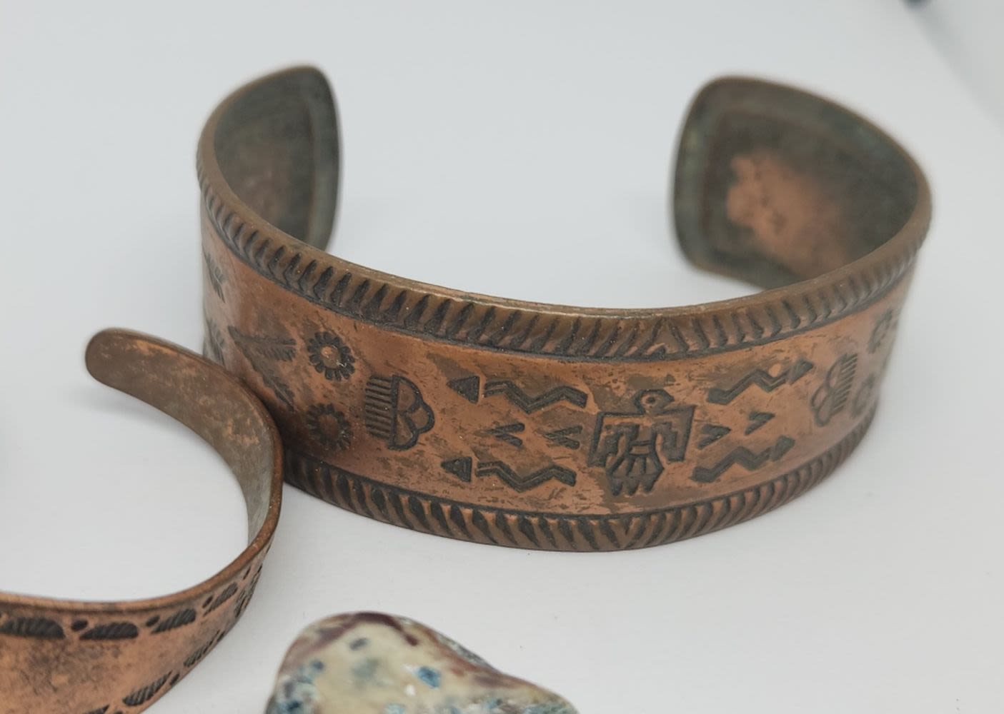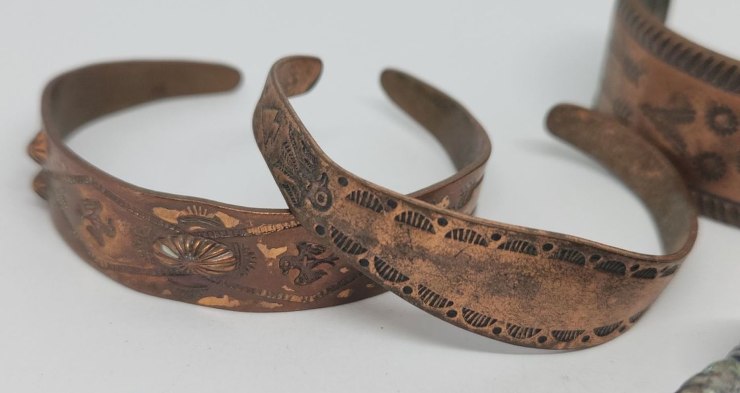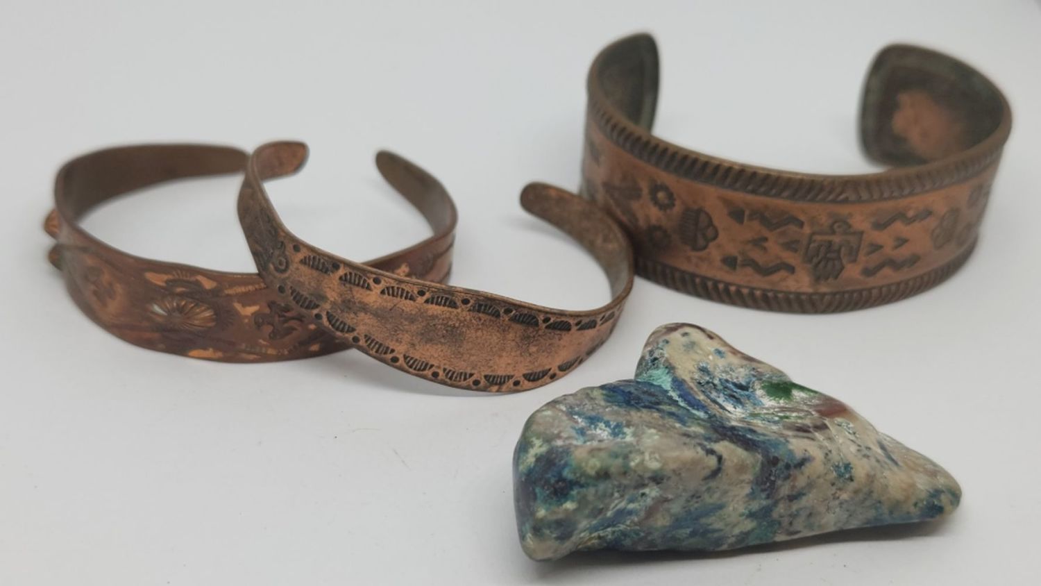 3 COPPER BRACELETS AND LARGE COLOR STONE