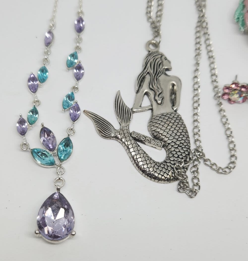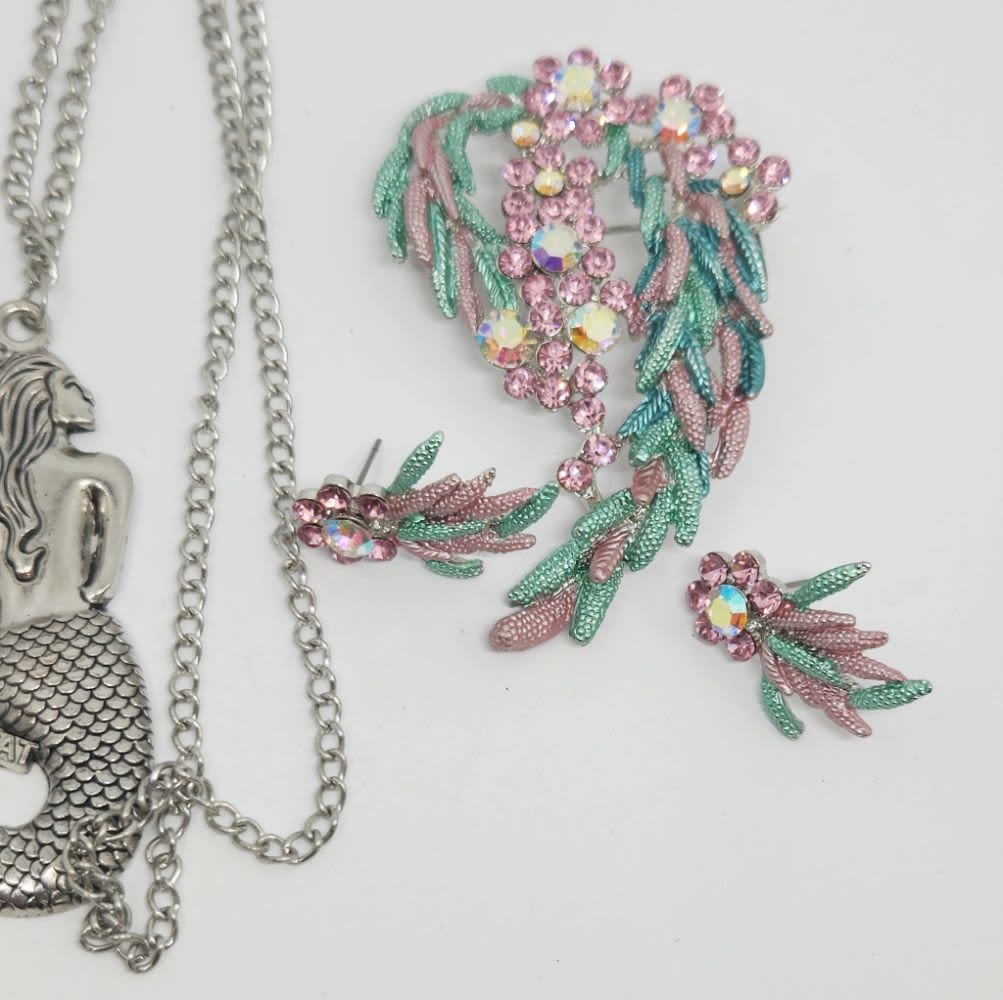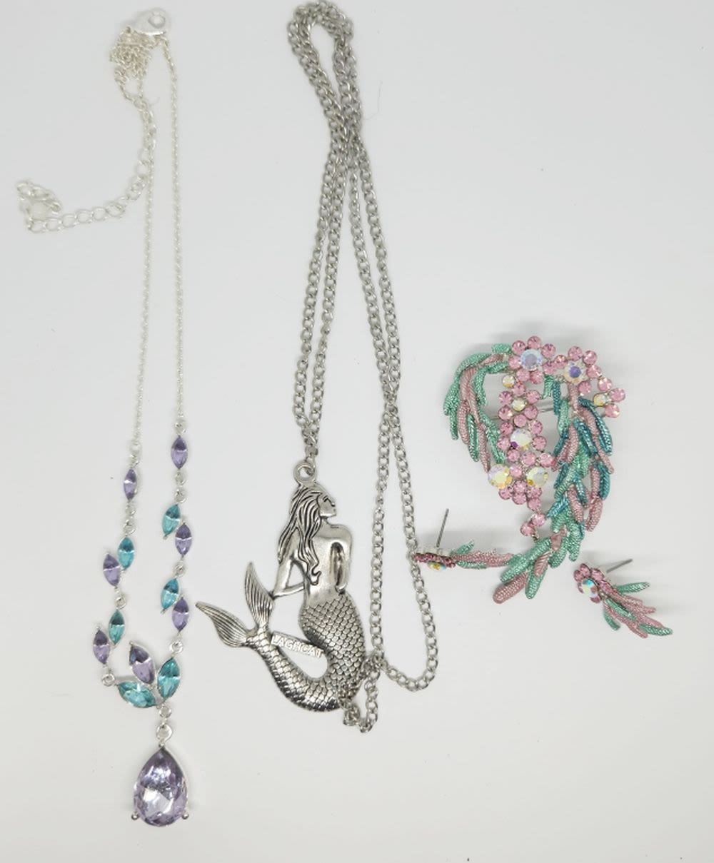 BROOCH COLOR STONE SET WITH EARRINGS + MERMAID NECKLACE AND OTHER STONE NECKLACE