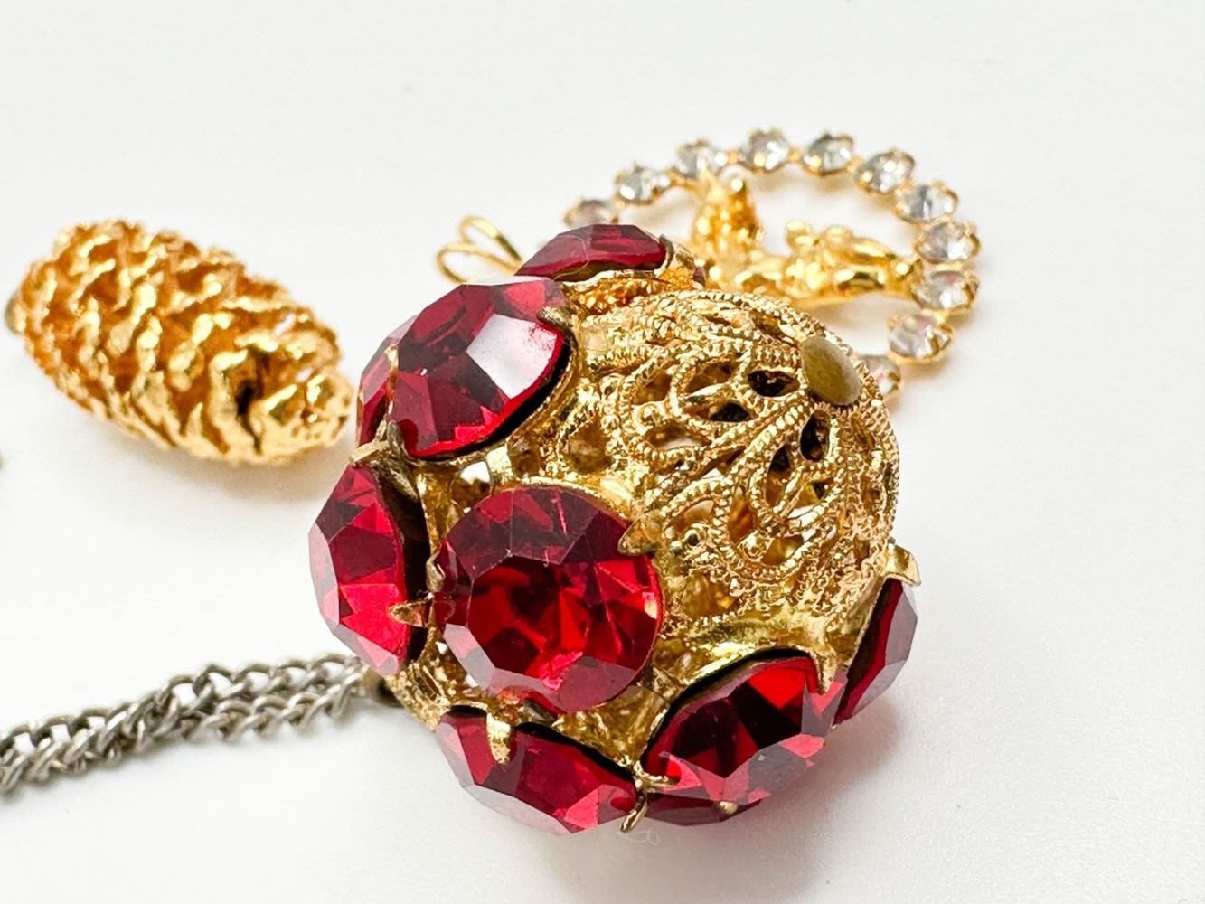 BEAUTIFUL RUBY RED STONE PENDANT BALL WITH FILIGREE IN GOLD TONE