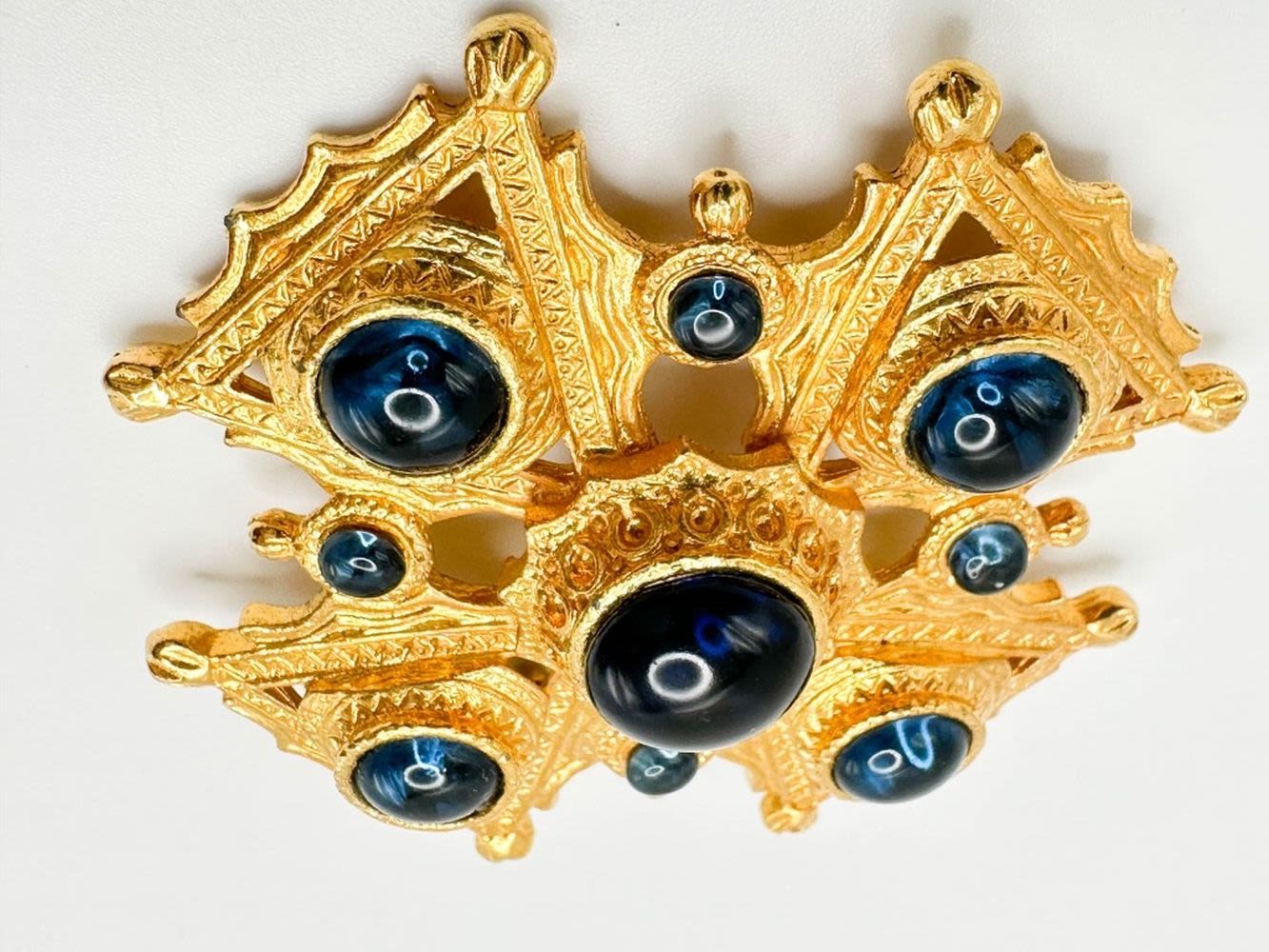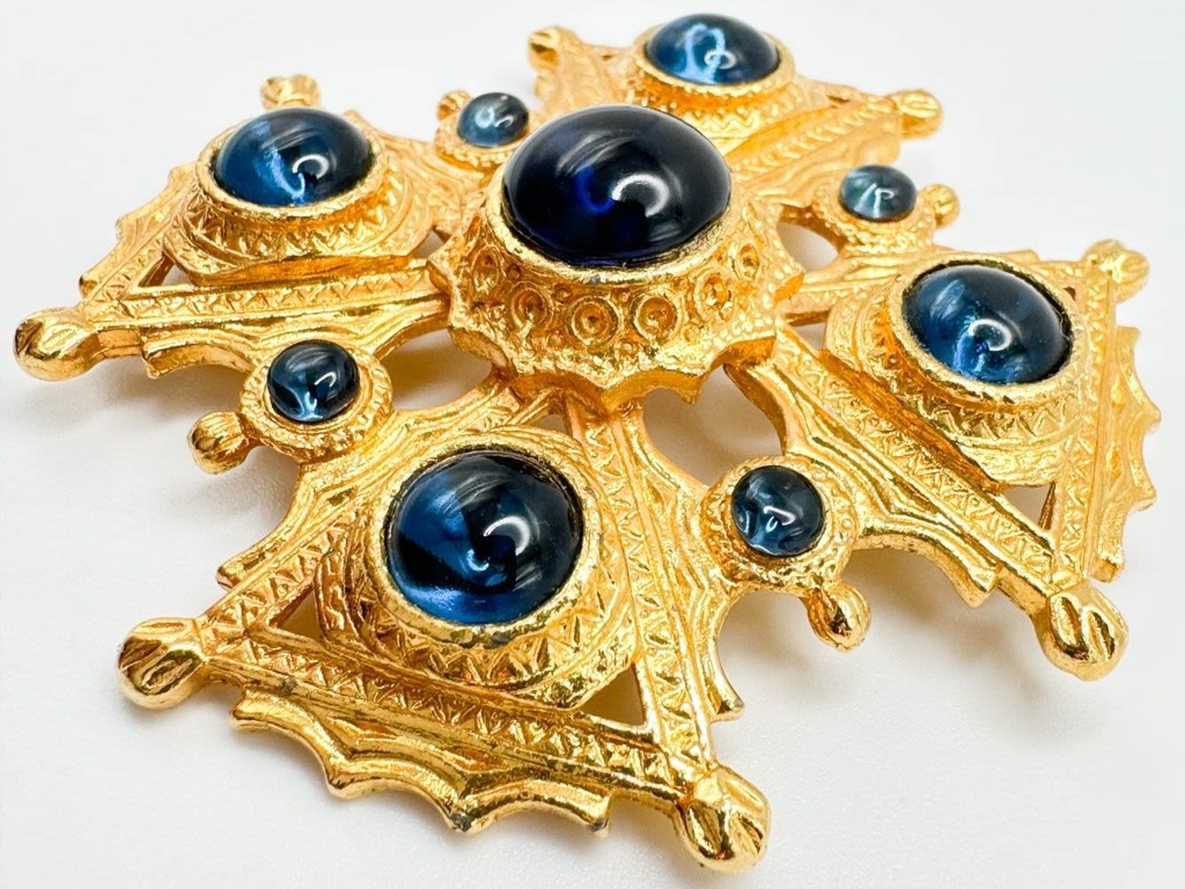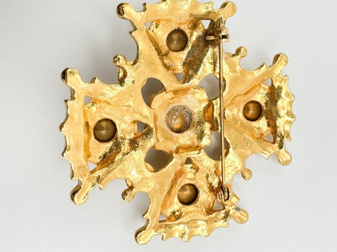 LARGE GOLD TONE MALTESE CROSS STYLE BROOCH WITH TWO SIZE OF LARGE STONES ON GOLD TONE