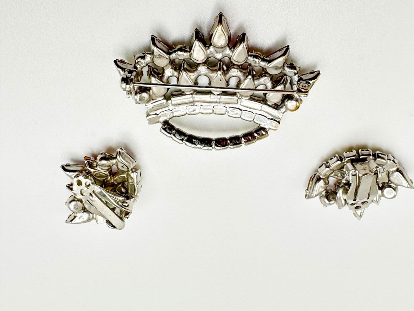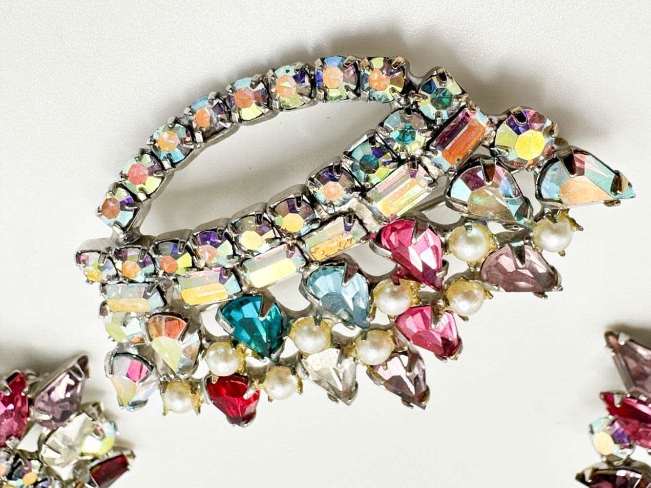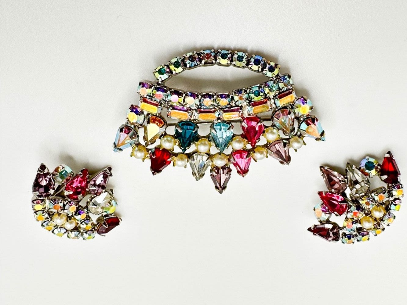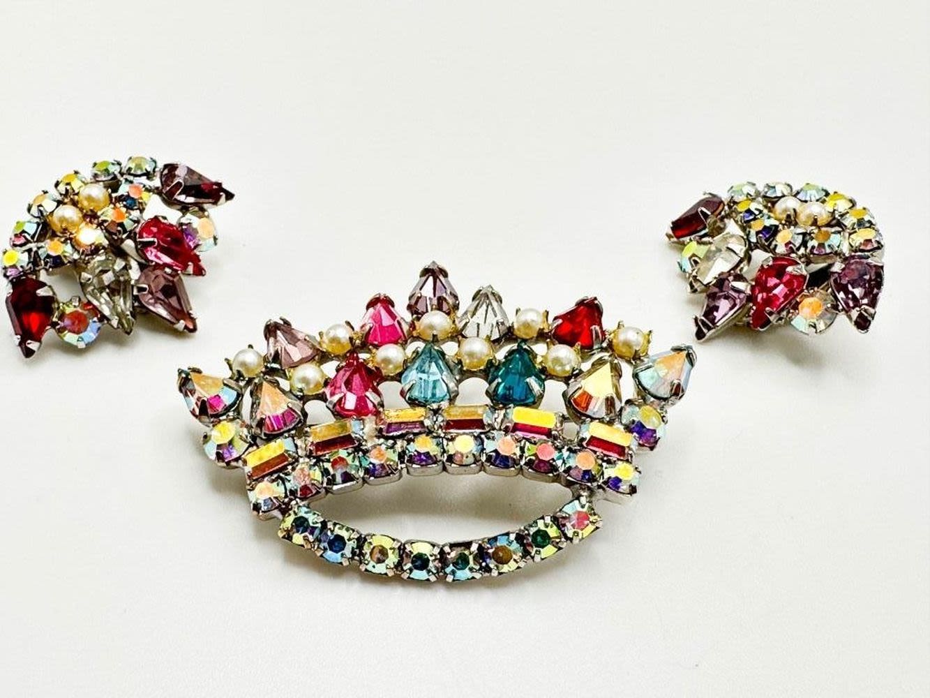 BROOCH AND EARRINGS CROWN SET WITH MULTI COLOR STONE SETTINGS