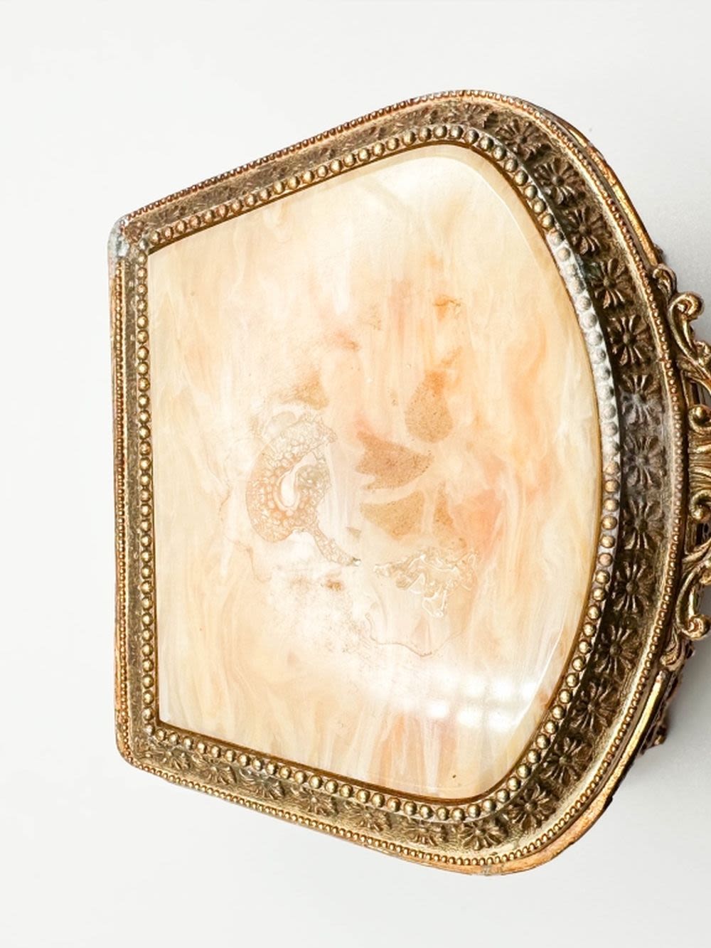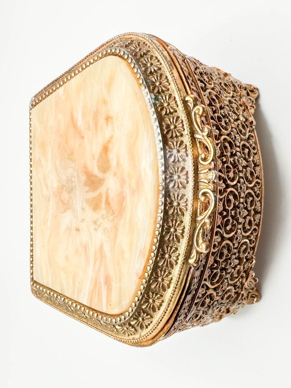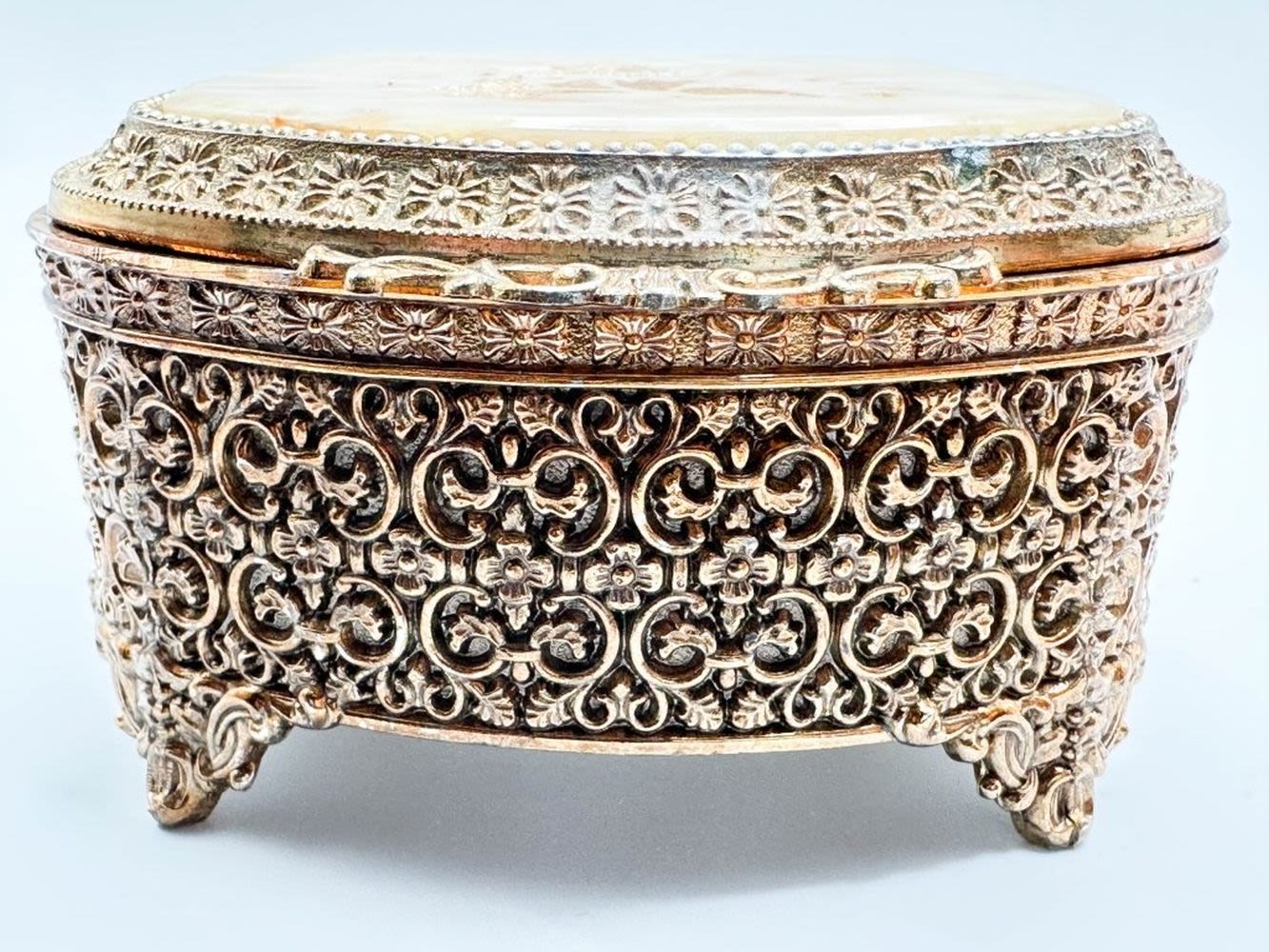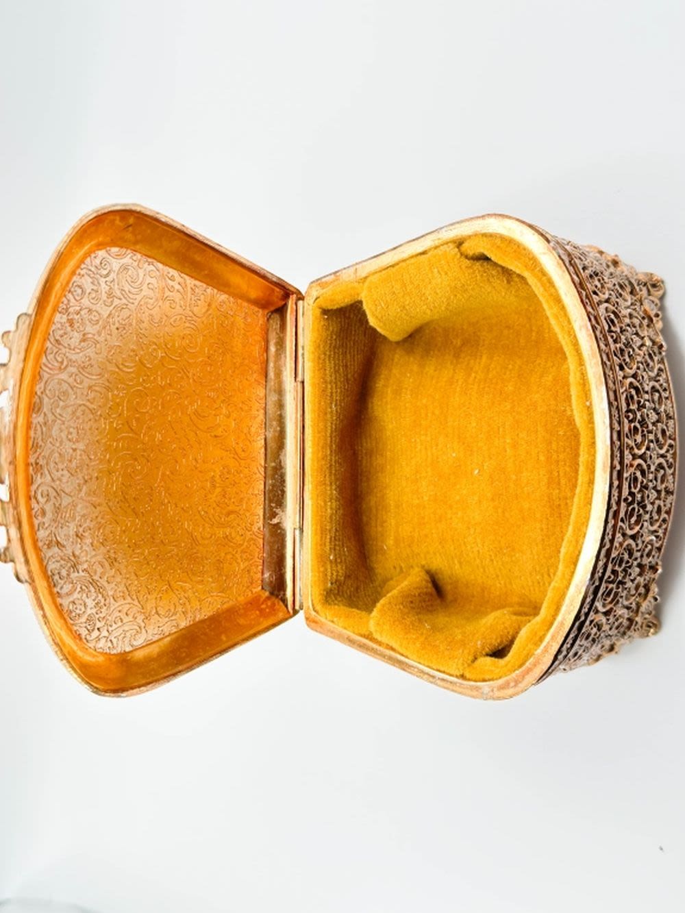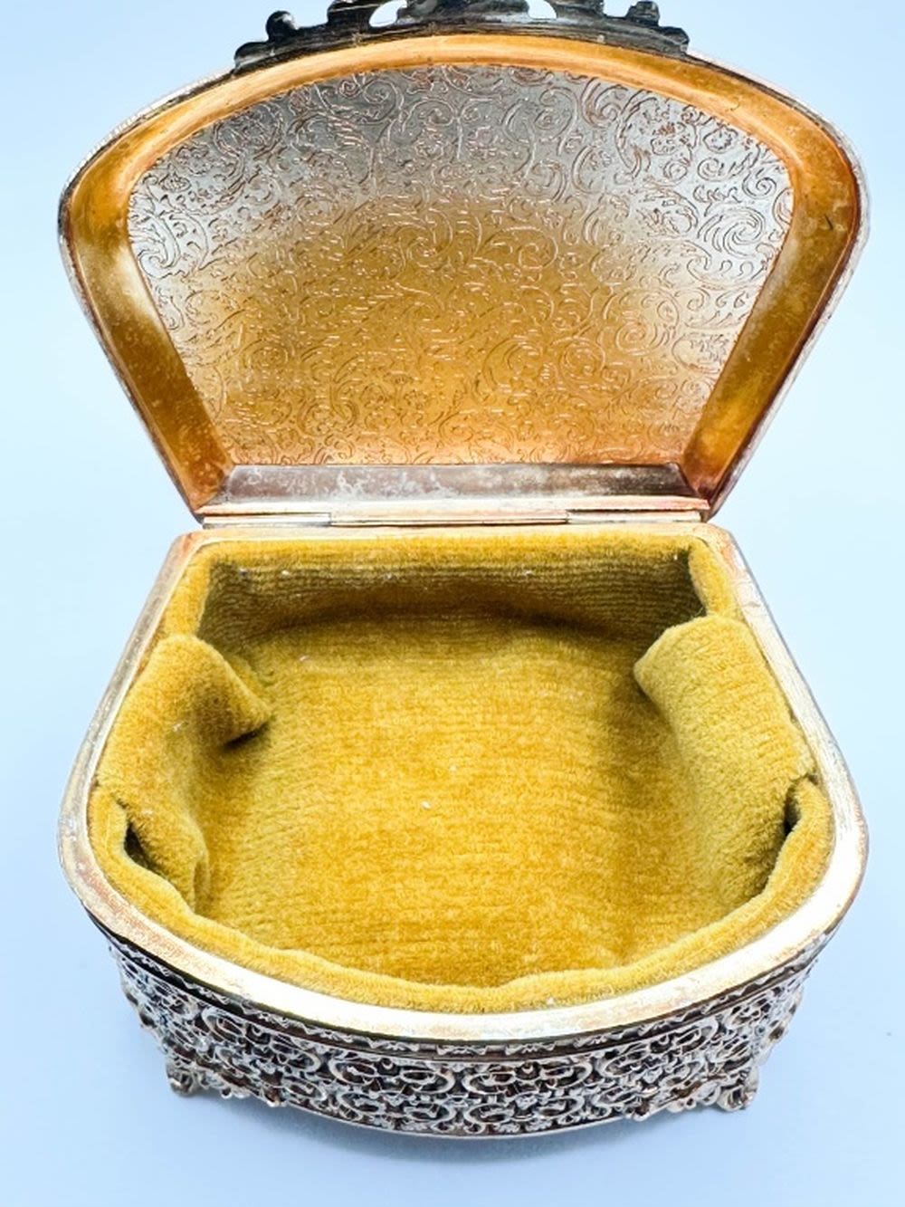 EXQUISITE FILIGREE METAL JEWELRY BOX WITH AMBER COLOR LINER