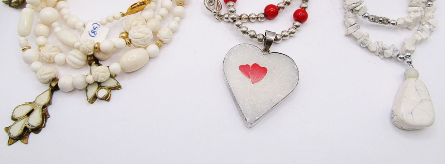 (1)STERLING BEADED NECKLACE WITH RED JASPER BEADS & STERLING HEART PENDANT WITH STONE INLAY (1)HOWLITE BEADED NECKLAE & (1)CARVED BONE BEADED NECKLACE-DIFF LENGTHS/DESIGNS