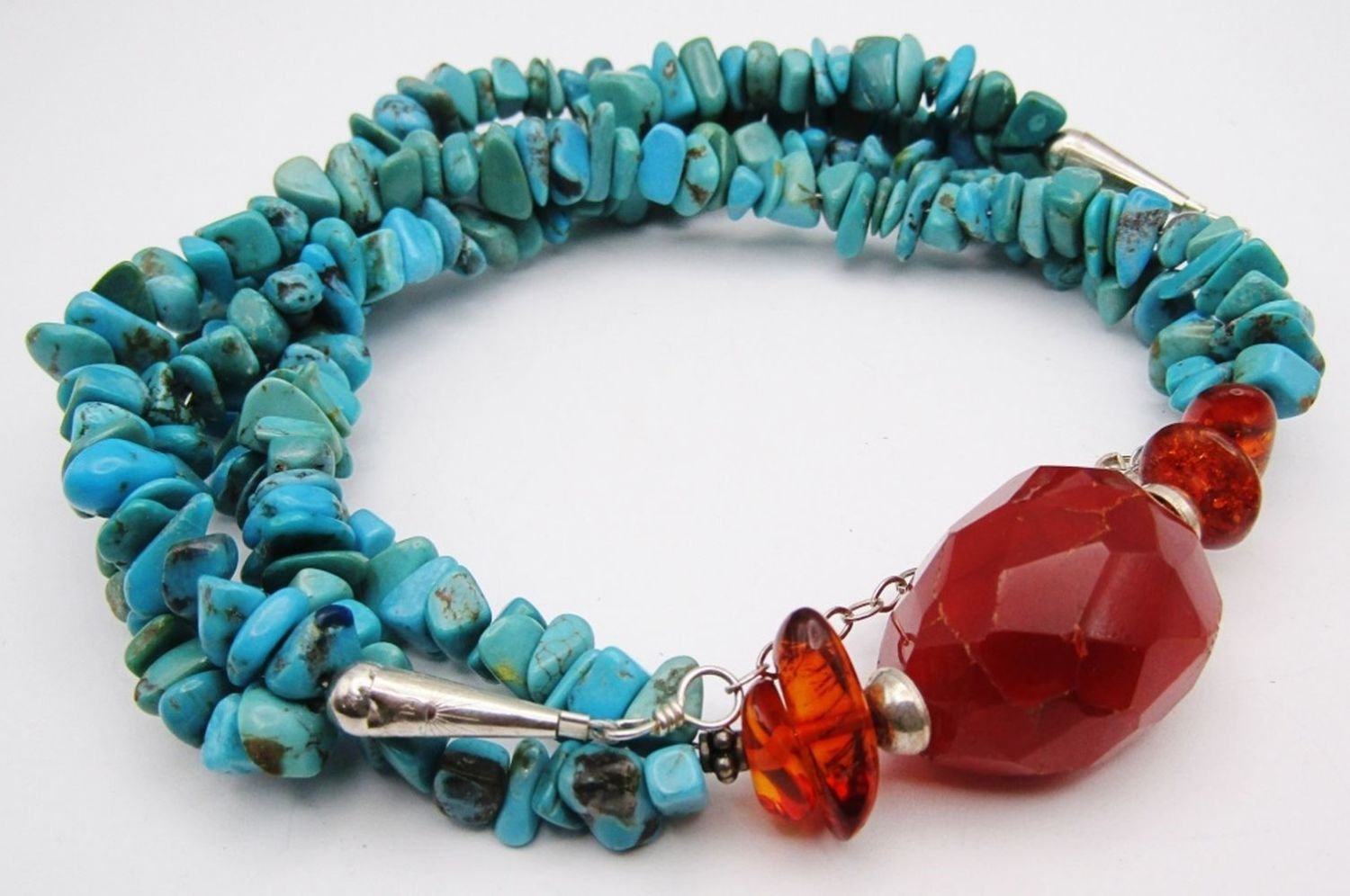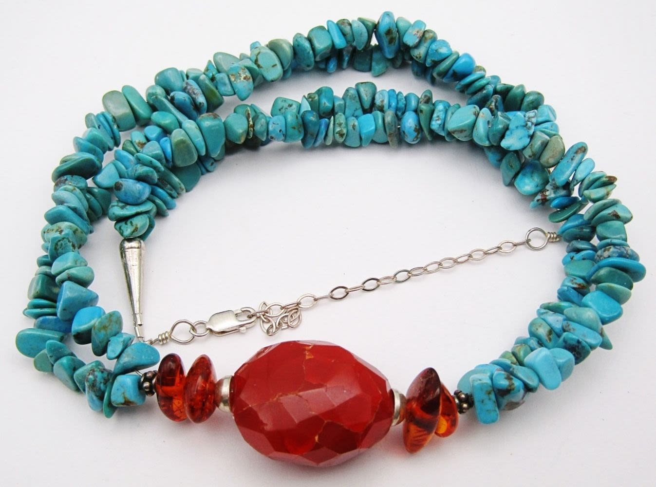 BEADED NECKLACE WITH LARGE AMBER STONE PENDANT-MEASURES 20.5 INCHES-TOTAL 37 DWT
