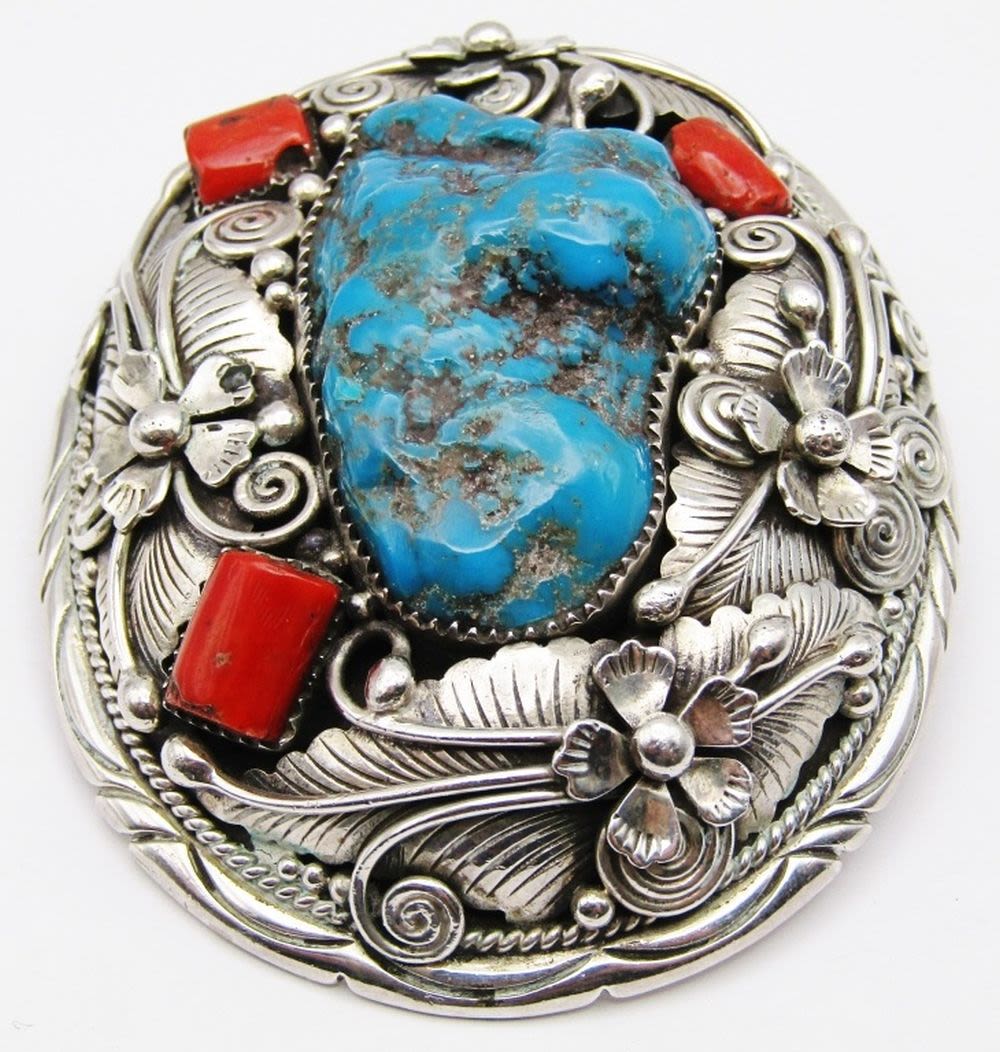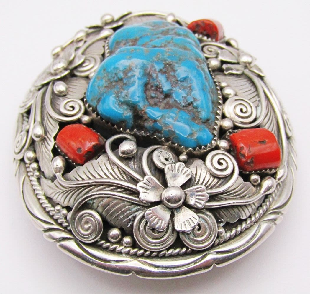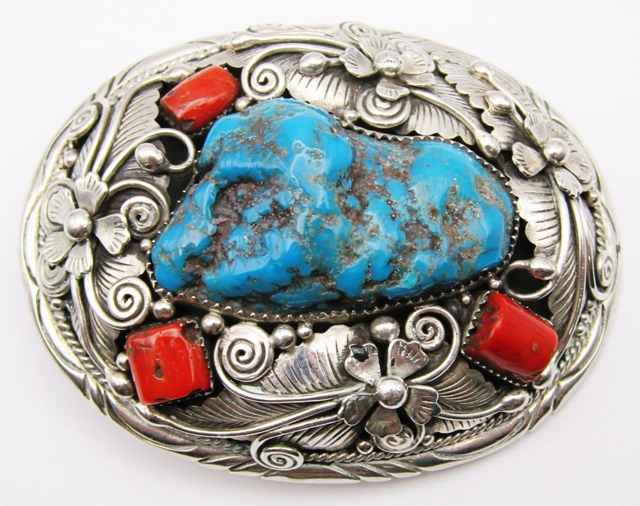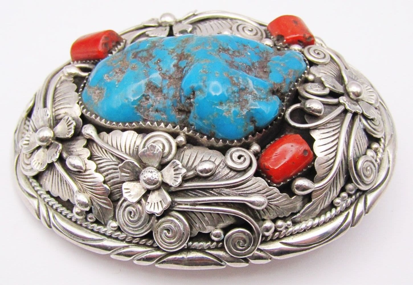 WITH LARGE TURQUOISE CENTER STONE & RED CORAL ACCENTS-FLOWER/LEAF DESIGN-TOTAL 80 DWT