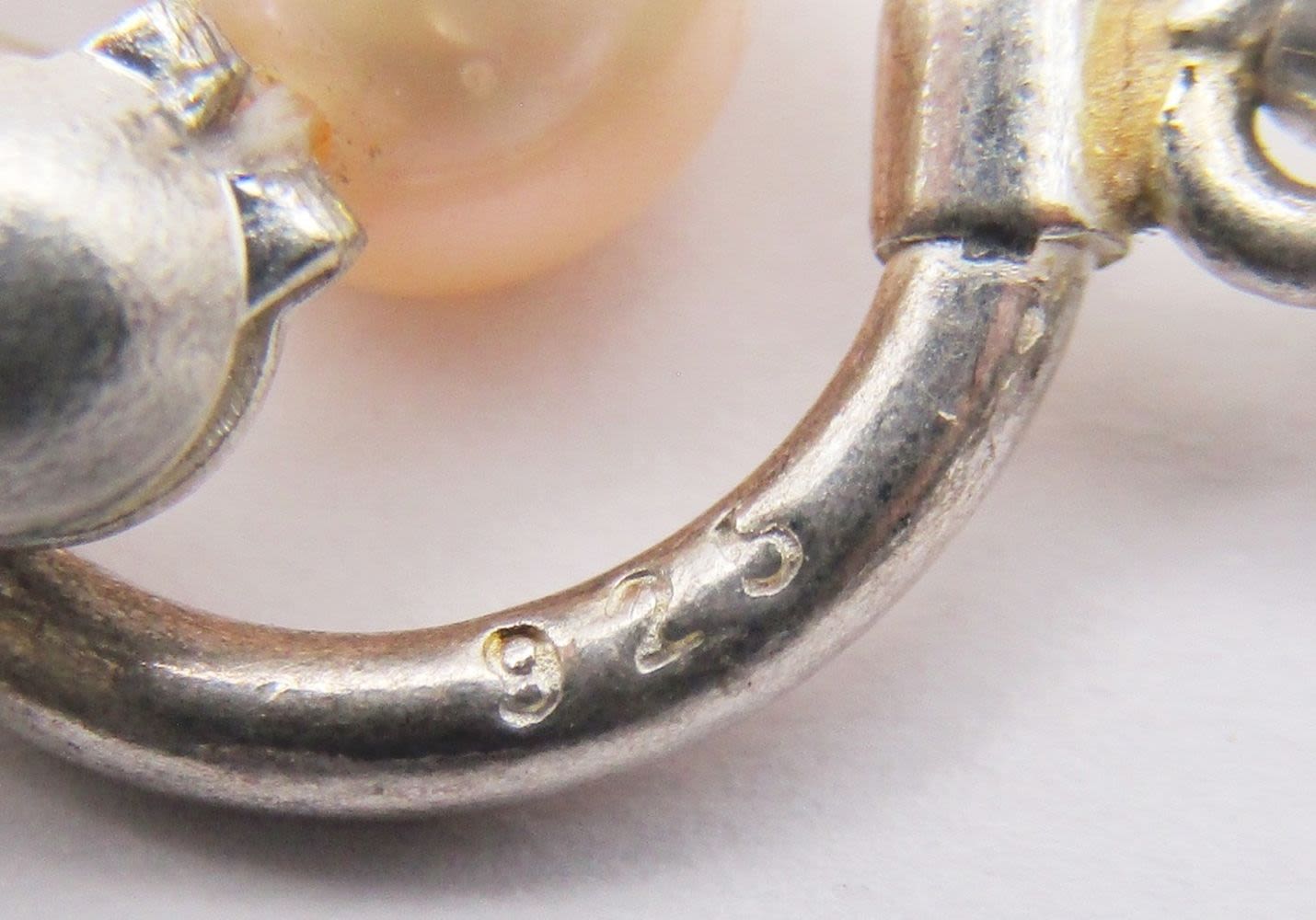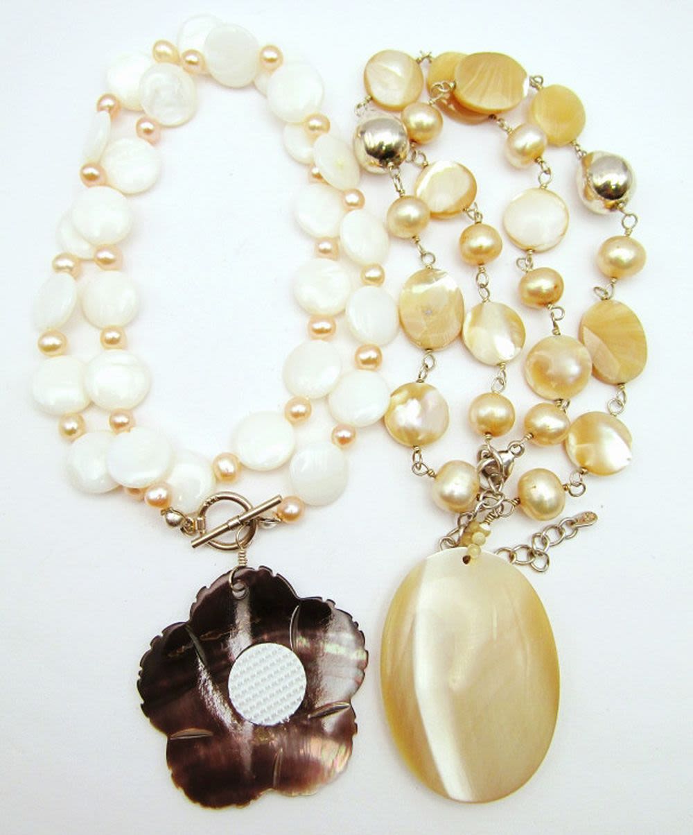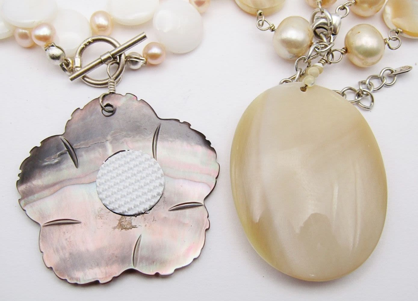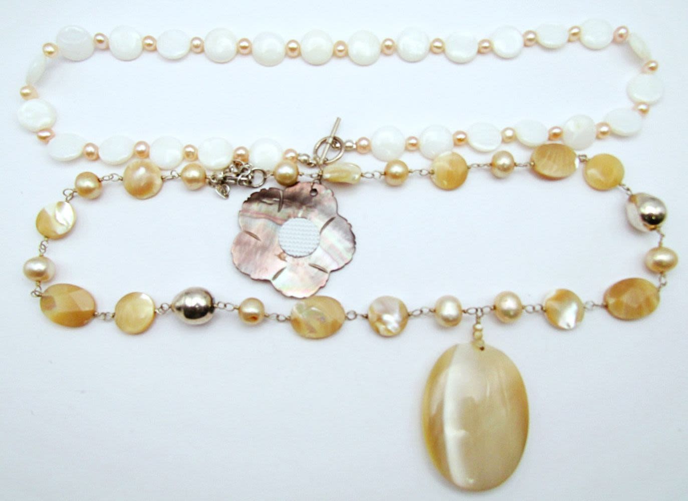 CRÈME AND PINK PEARL BEADED NECKLACE WITH CARVED FLOWER PENDANT WITH 925 TOGGLE CLASP & (1)20 INCH SHELLS BEADED STERLING NECKLACE-TOTAL 44 DWT