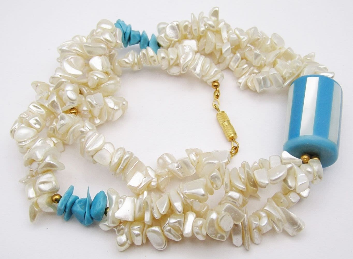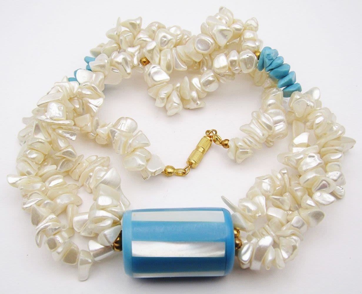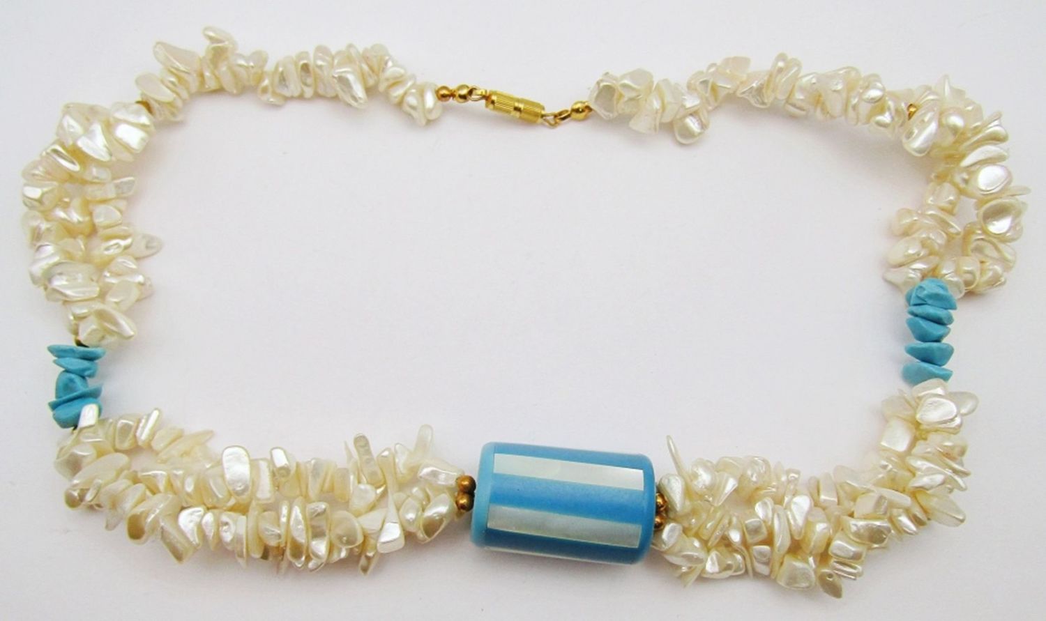 PEARL NECKLACE WITH CHIPPED TURQUOISE ACCENTS-WITH TURQUOISE 3-D PENDANT WITH MOTHER OFPEARL INLAY DESIGN-MEASURES 19 INCHES