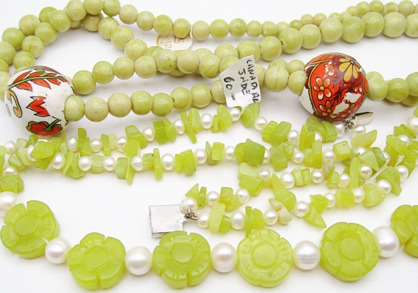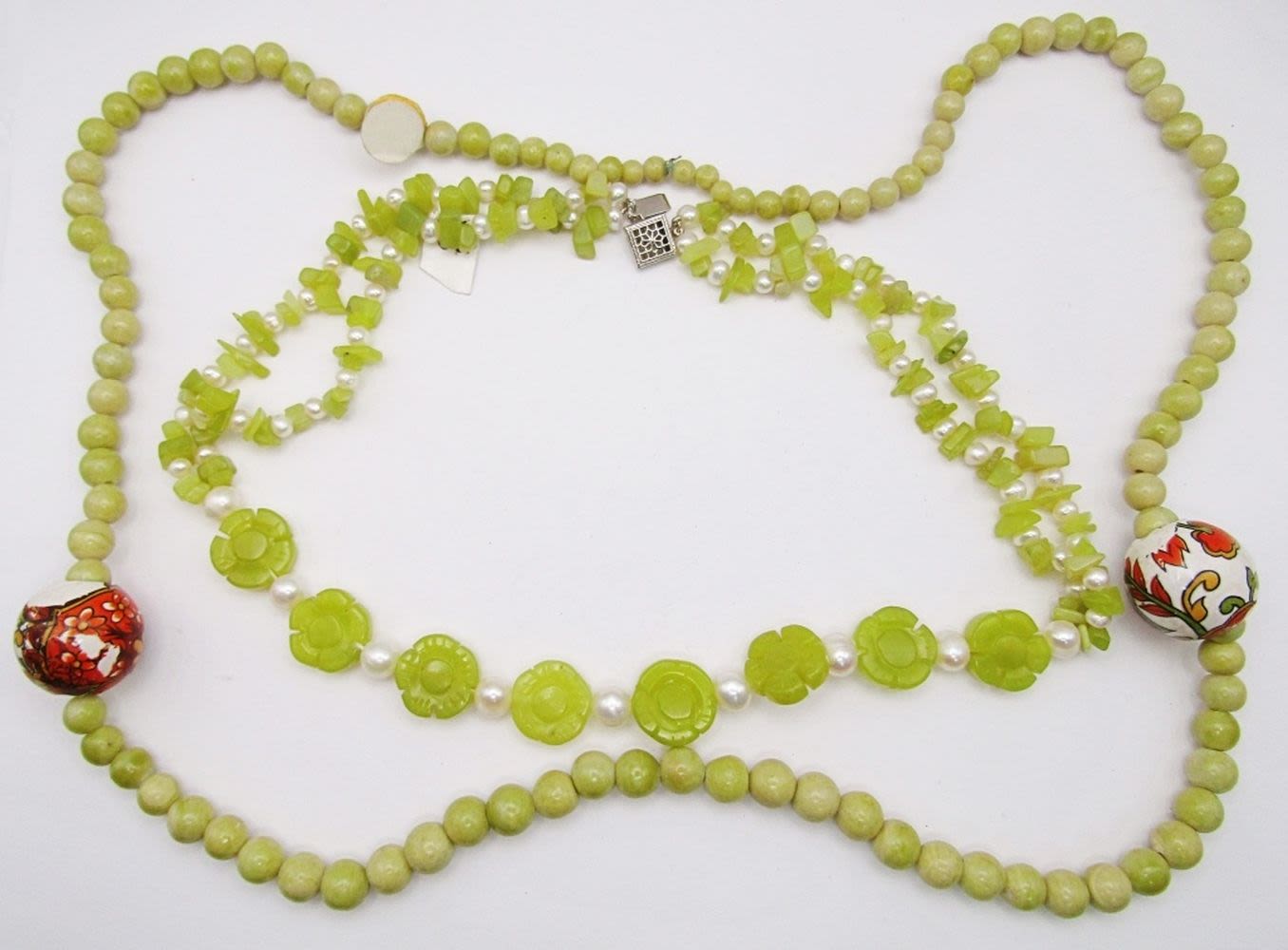 NECKLACE PLUS 30 INCH LIGHT GREEN STONE BEADED NECKLACE WITH FLORAL PAINTED BALL ACCENTS