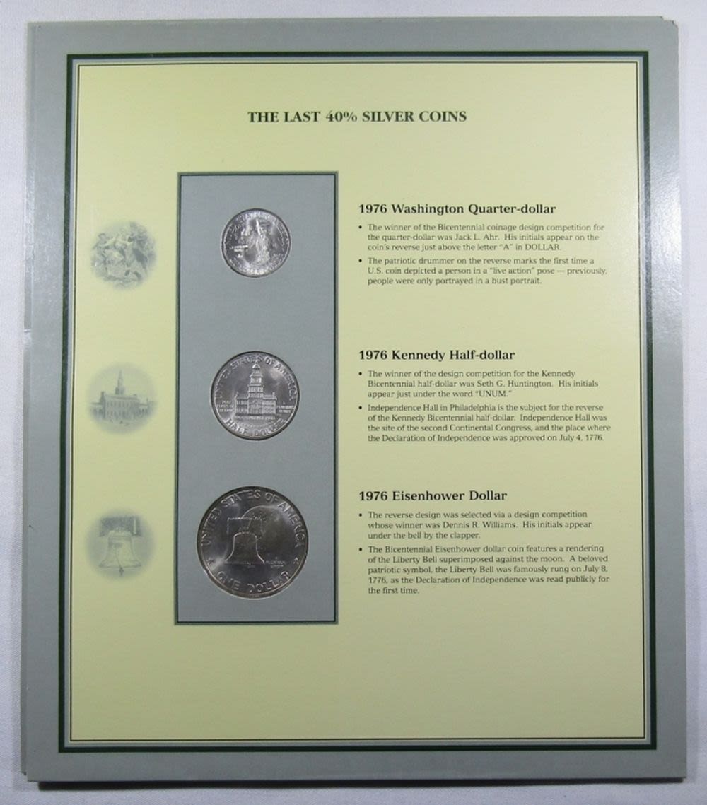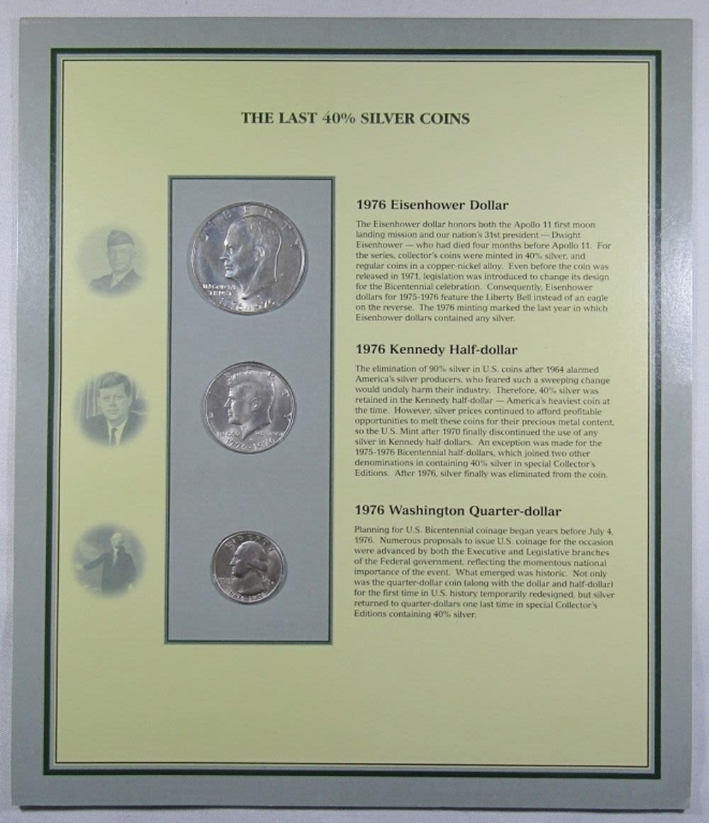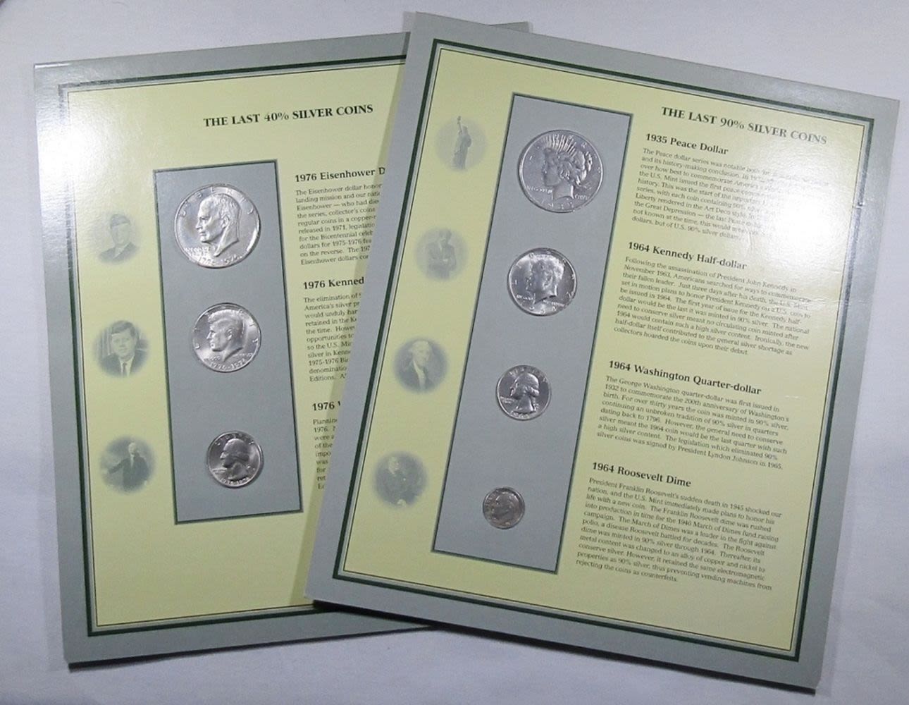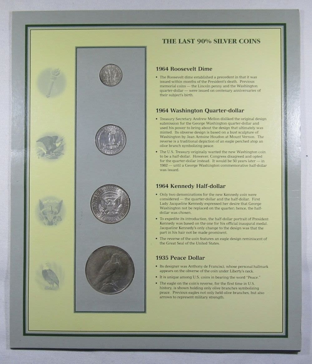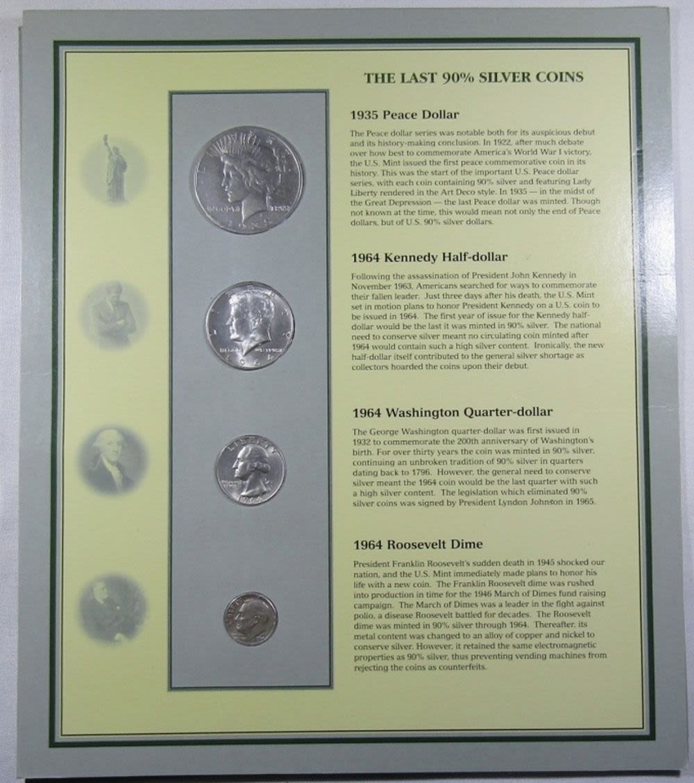 1976 IKE, KENNEDY HALF & QTR all 40% SILVER plus 1935 PEACE DOLLAR, 1964 KENNEDY HALF, 1964 WASHINGTON QTR & DIME – NICE DISPLAY COLLECTORS SET