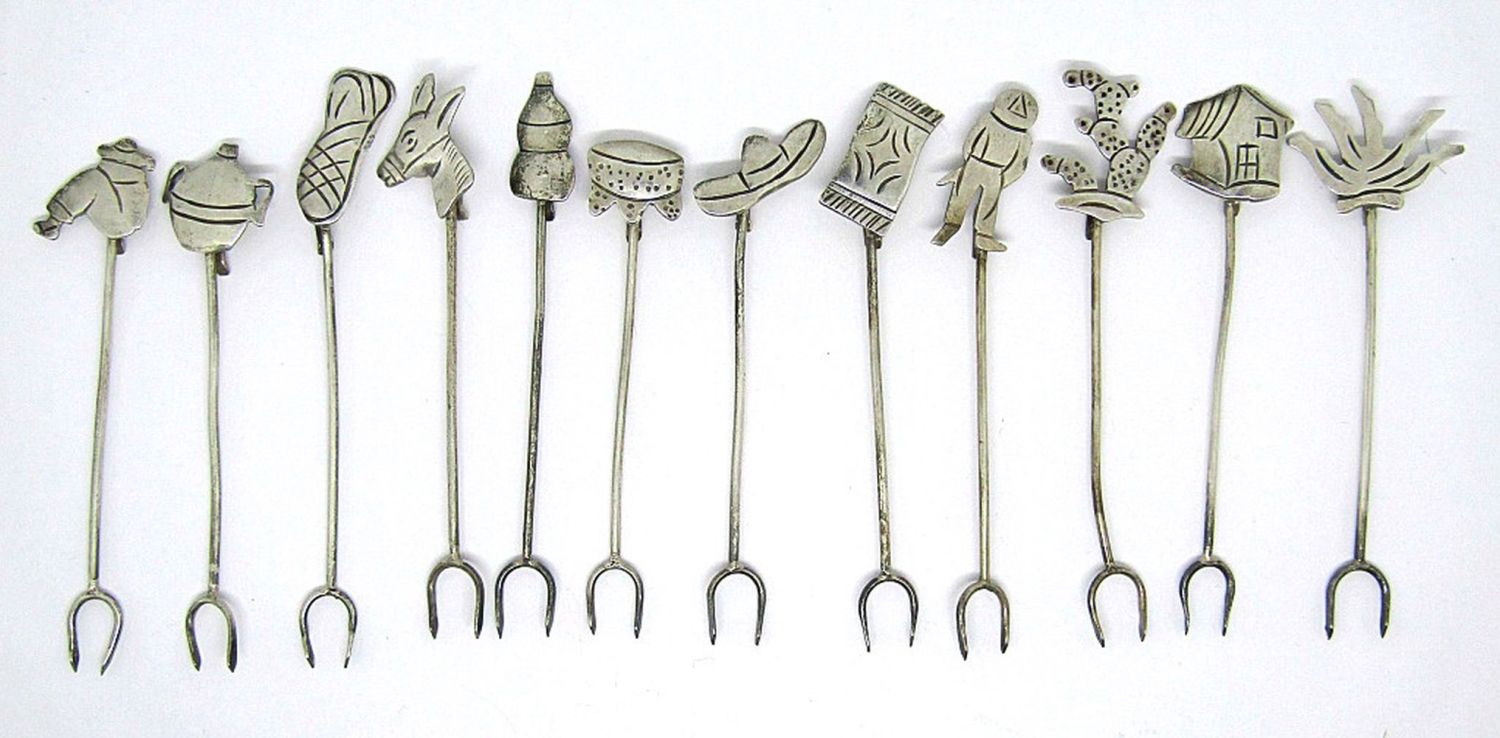 12 solid sterling appetizer forks all with different southwest themed designs on the top. (16 dwt)