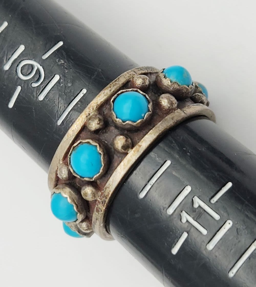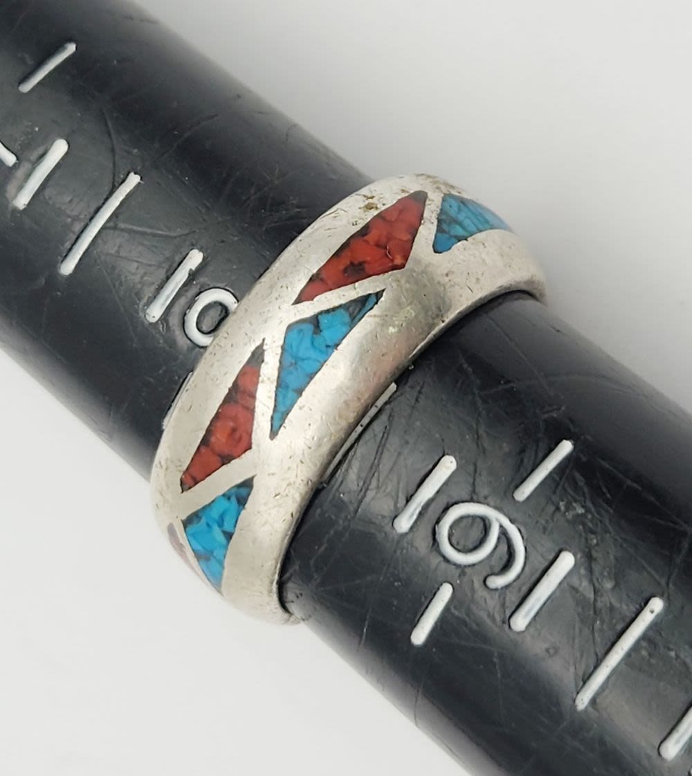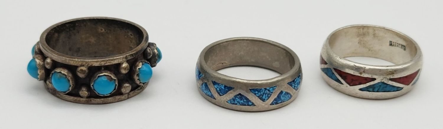 (1)WITH CHIPPED TURQUOISE INLAY (1)WITH CHIPPED TURQUOISE AND RED CORAL & (1)WITH SLEEPING BEAUTY STONES-VARIOUS SIZES 8-10-TOTAL 13 DWT