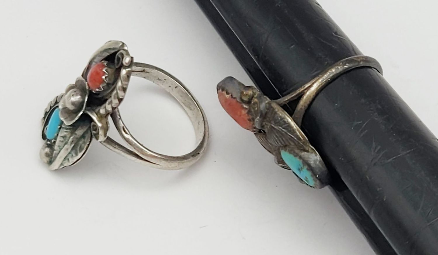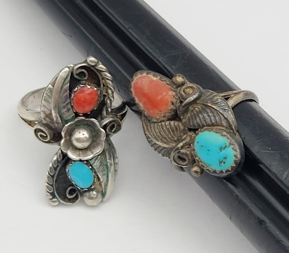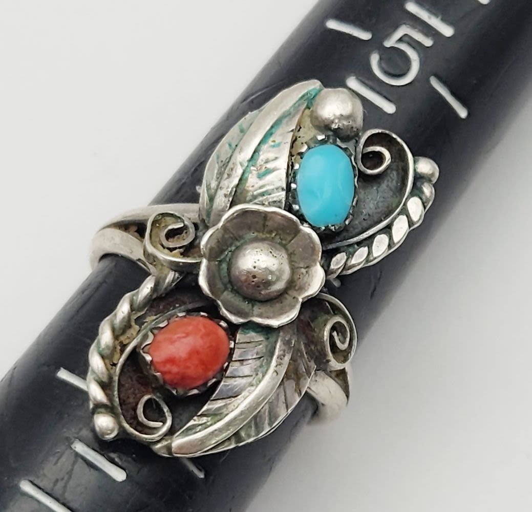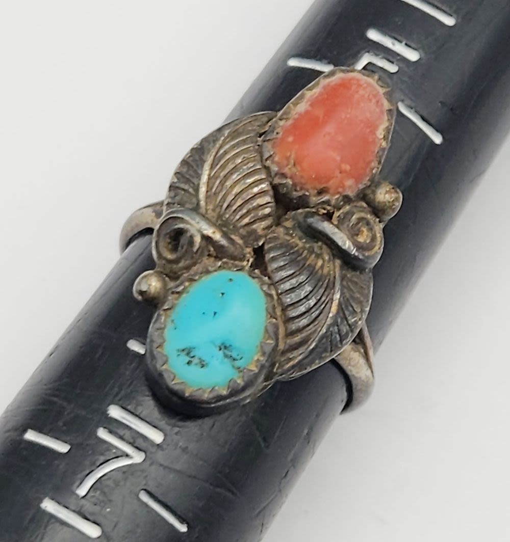 LEAF DESIGN-RED CORAL AND TURQUOISE STONE ACCENTS-RING SIZES 6 & 6.5-TOTAL 5 DWT