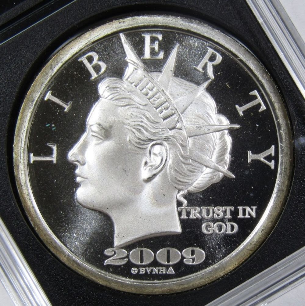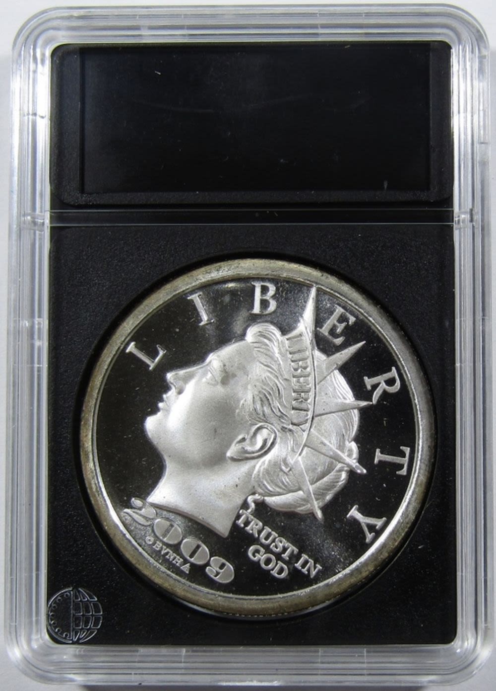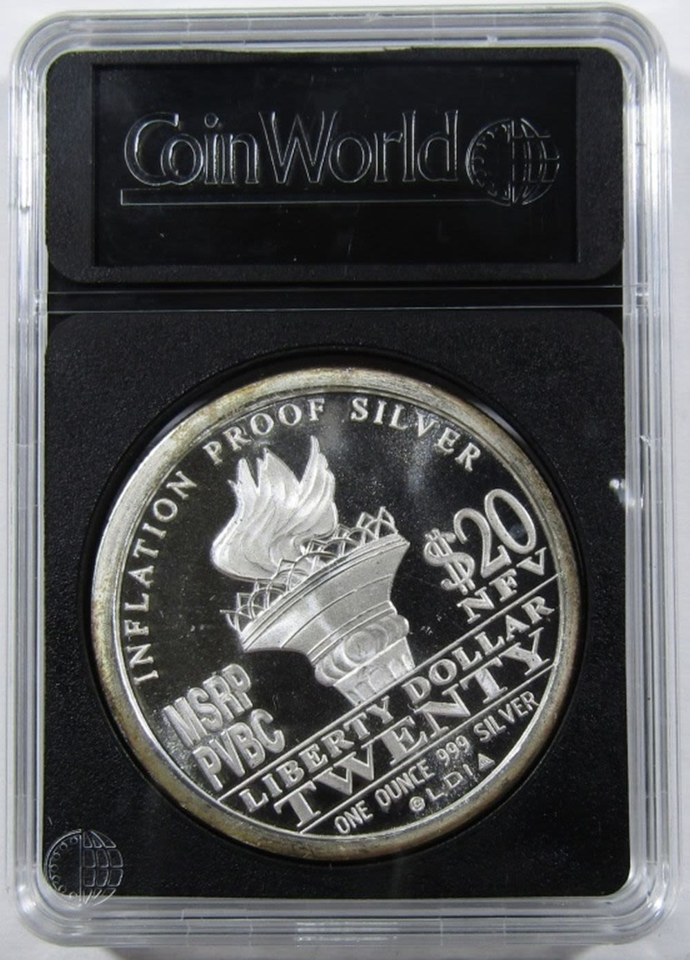 “$20 LIBERTY DOLLAR” SILVER ROUND IN PLASTIC SLAB.