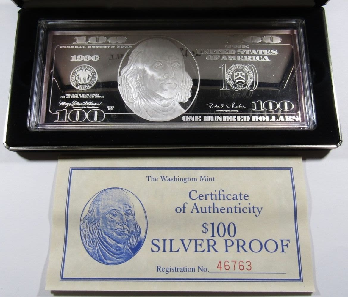 QUARTER-POUND SILVER PROOF, THE WASHINGTON MINT, IN BOX WITH COA.