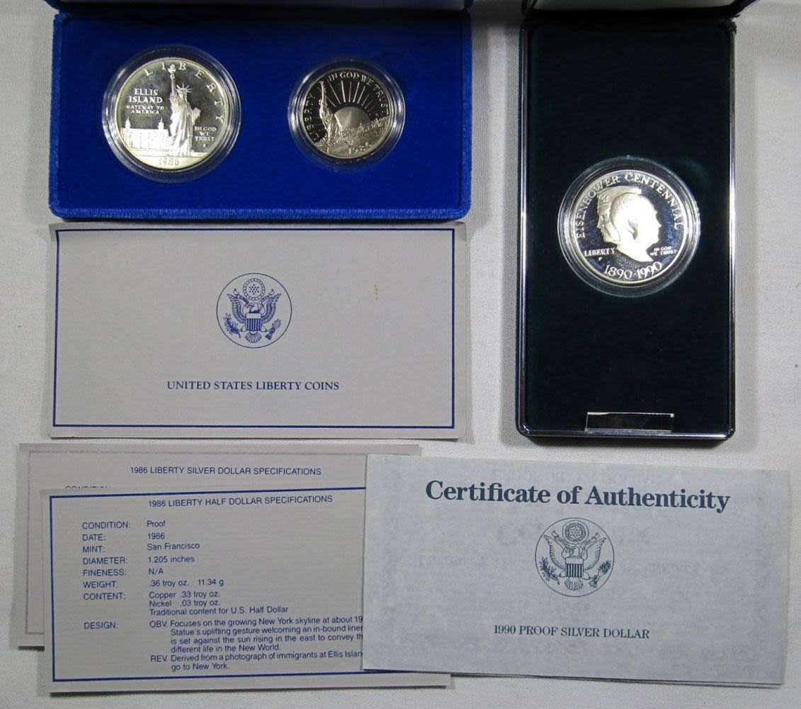1990 IKE CENTENNIAL PROOF SILVER DOLLAR AND 2PCS 1986 PROOF U.S. LIBERTY COINS